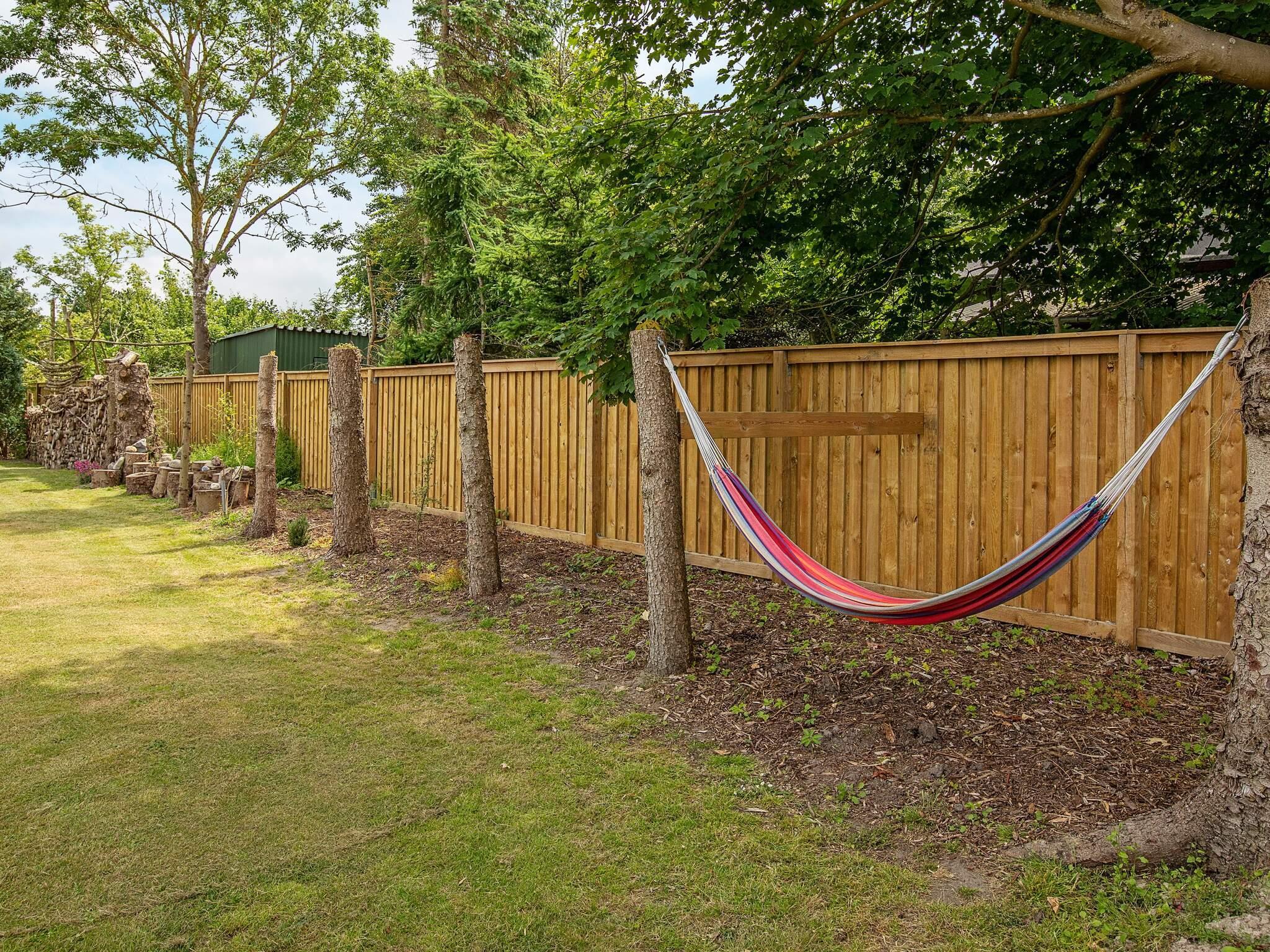 Vom Wohnzimmer aus hat man Zugang zu einer überdachten Terrasse, einer offenen Terrassenfläche und dem Grundstück, wo Sie grillen und Ihren Urlaub genießen können. Das 1.400 m2 große Naturgrundstück ist teilweise eingezäunt.