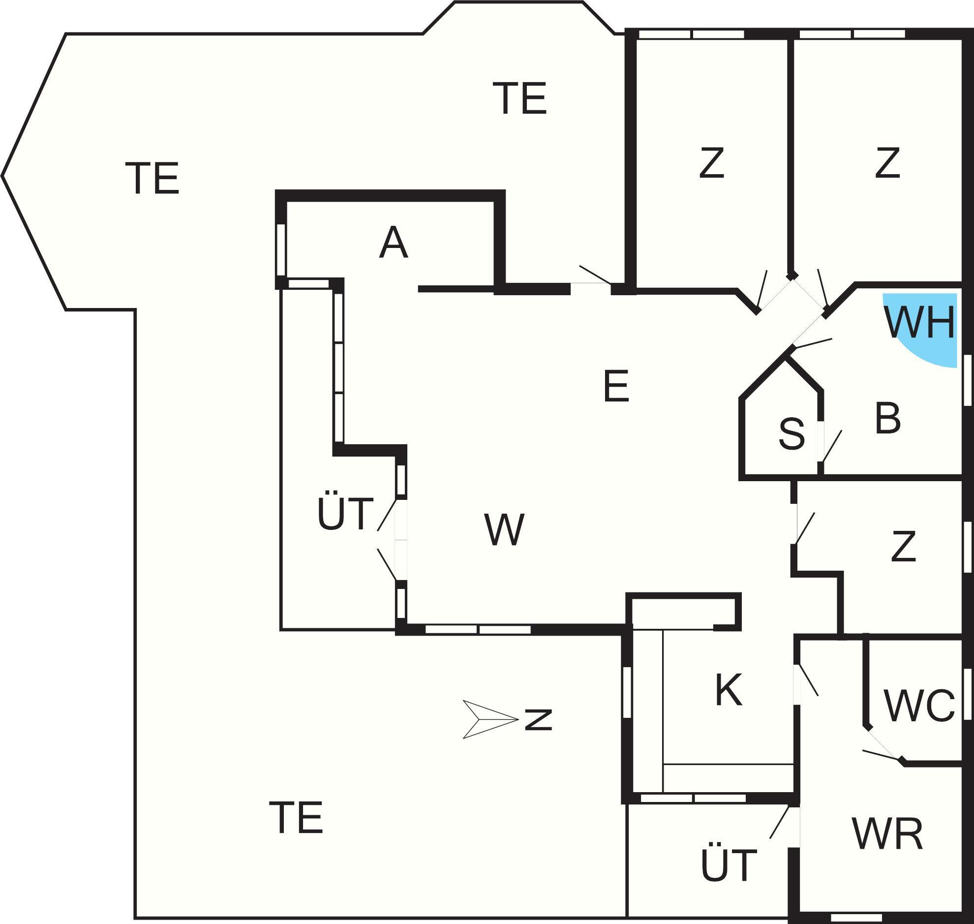 Bad: WC, Waschb., Dusche, Fußbodenheiz.
