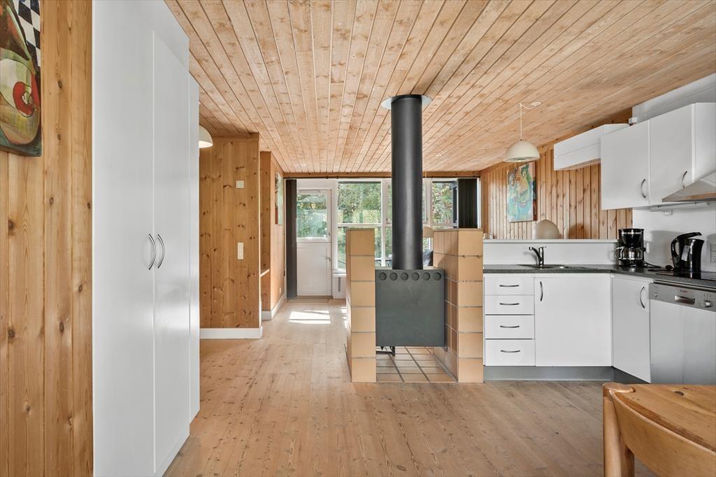 Das Ferienhaus verfügt über: 2 gute Schlafzimmer, eine schöne Wohnküche mit Holzofen und Sofaecke sowie Zugang zur Terrasse auf beiden Seiten des Hauses, von denen eine überdacht ist. Darüber hinaus ein schönes Badezimmer mit WC und Duschkabine.