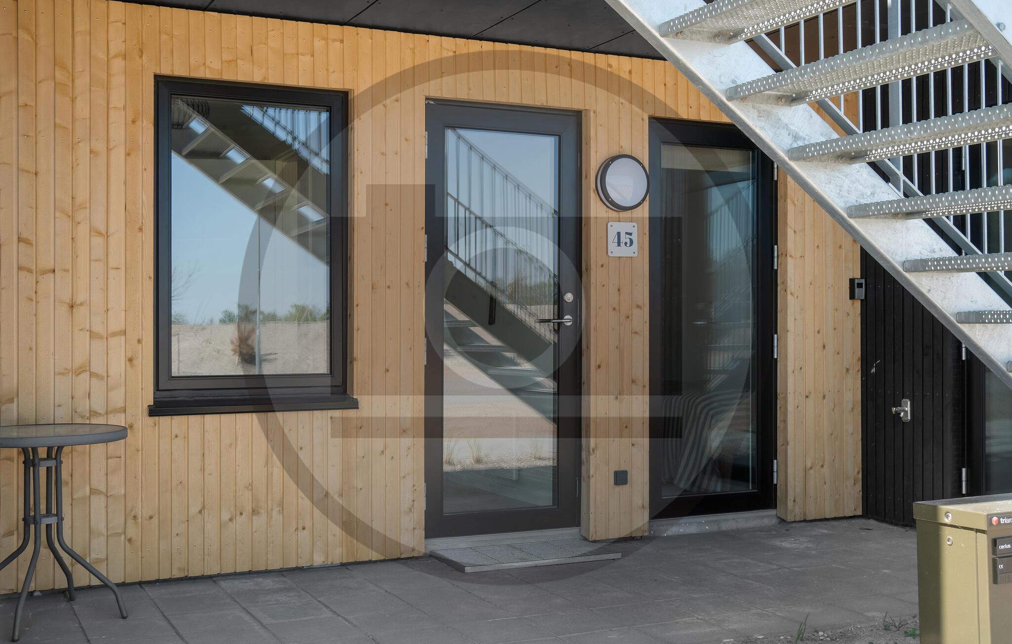 Moderne Erdgeschosswohnung nahe Sandstrand mit Meerblick, Veranda und Spielplatz für entspannte Ferien in Dänemark.