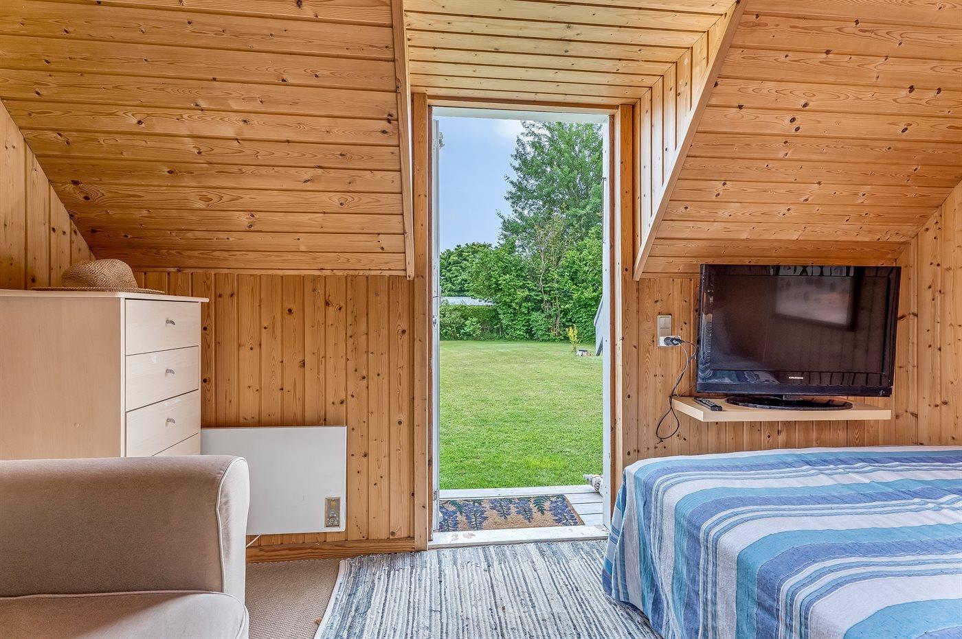 Es gibt einen Schlafraum. 4 Schlafplätze in Doppelbetten. 2 von diesen Schlafplätzen befinden sich im Gästehaus.