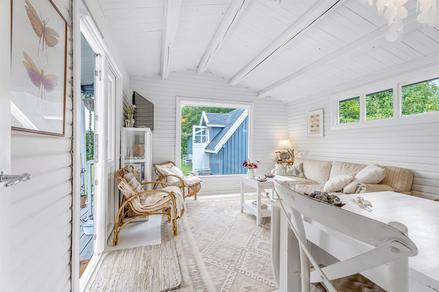 Es ist gemütlich und liebevoll eingerichtet – mit Küche, einem kleinen Gäste-WC (ohne Dusche), einem Schlafzimmer und einem hellen Wohnzimmer mit großem Panoramafenster und Blick in den schönen Garten. Auf der Rückseite des Hauses findest du die Außendusche, wo du nach einem Sprung in die Ostsee die warmen Wasserstrahlen genießen kannst.