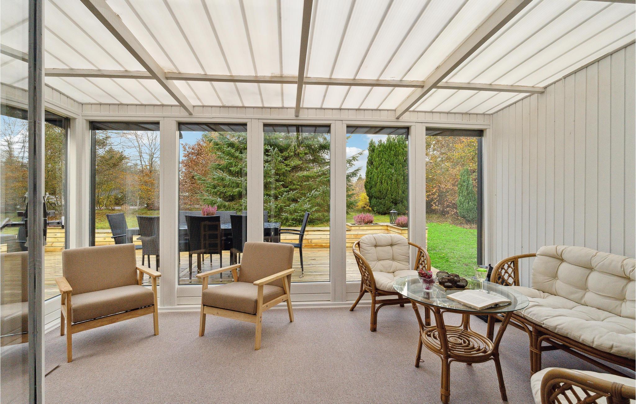 Die geschmackvolle Einrichtung, helle Räume und die schöne Holzverkleidung machen es zum richtigen Ort, um mit der Familie zu entspannen. Ob beim gemeinsamen Kochen und Essen oder beim Plaudern auf dem gemütlichen Sofa mit Blick in den Garten, hier können Sie die gemeinsame Zeit in vollen Zügen genießen. Sorgen Sie mit einem Feuer im Kaminofen für eine besonders behagliche Stimmung und genießen Sie schöne Ausblicke durch die große Fensterfront.