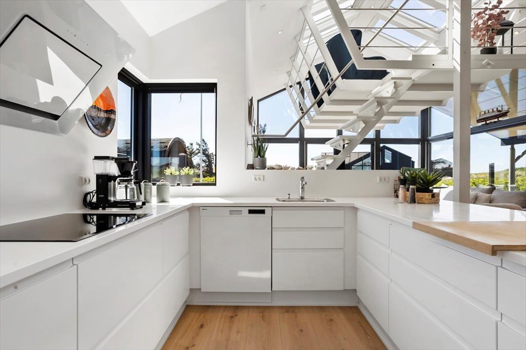 Der große, hohe Wohnbereich ist der perfekte Treffpunkt für gemeinsame Stunden – sei es beim Kochen in der offenen Küche, beim Filmeschauen auf dem Flachbildfernseher oder beim Entspannen vor dem Kamin. Für einen atemberaubenden Meerblick nehmen Sie die Treppe hinauf zum erhöhten Plateau, das sich wie eine schwebende Erweiterung des Wohnraums anfühlt. Von hier oben genießen Sie eine fantastische Aussicht über das wunderschöne Ferienhausgebiet mit der Nordsee im Hintergrund. Eine gemütliche Schlafempore mit Matratzen ergänzt die gelungene Raumaufteilung.