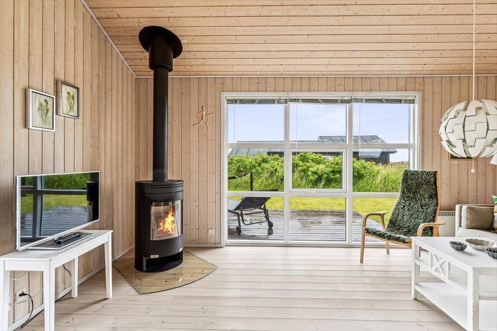 Wenn Sie das Sommerhaus betreten, erwartet Sie eine helle und luftige Einrichtung mit einem hohen, offenen Dach, das dem Raum eine wunderbare Großzügigkeit verleiht. Die großen Fenster lassen die Natur und das Licht herein und bieten einen fantastischen Blick auf die umliegenden Inlanddünen. Der offene Wohnbereich ist perfekt zum Entspannen und Beisammensein, wo Sie sich vor dem gemütlichen Kamin entspannen oder eine Mahlzeit genießen können, während Sie auf die schöne Natur blicken. Die einfache, helle Einrichtung schafft eine ruhige und entspannte Atmosphäre, die sowohl zum Wohlfühlen als auch zum Innehalten einlädt.