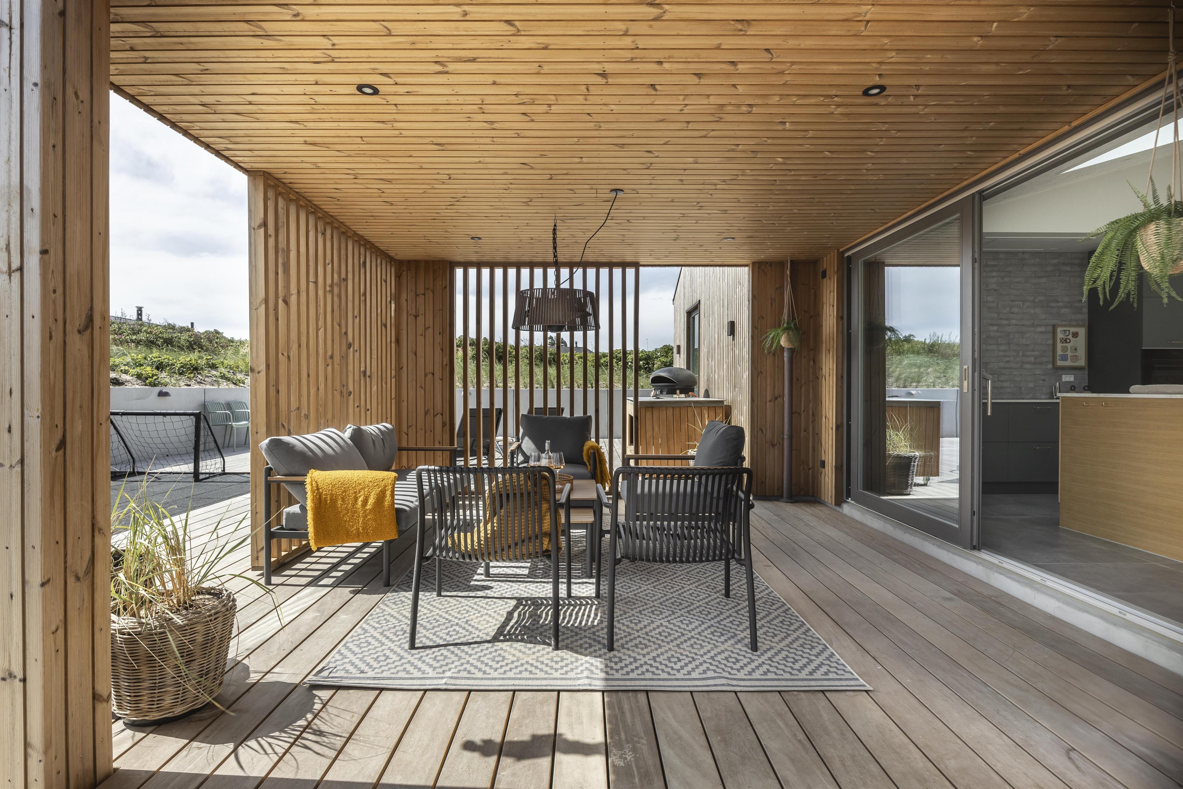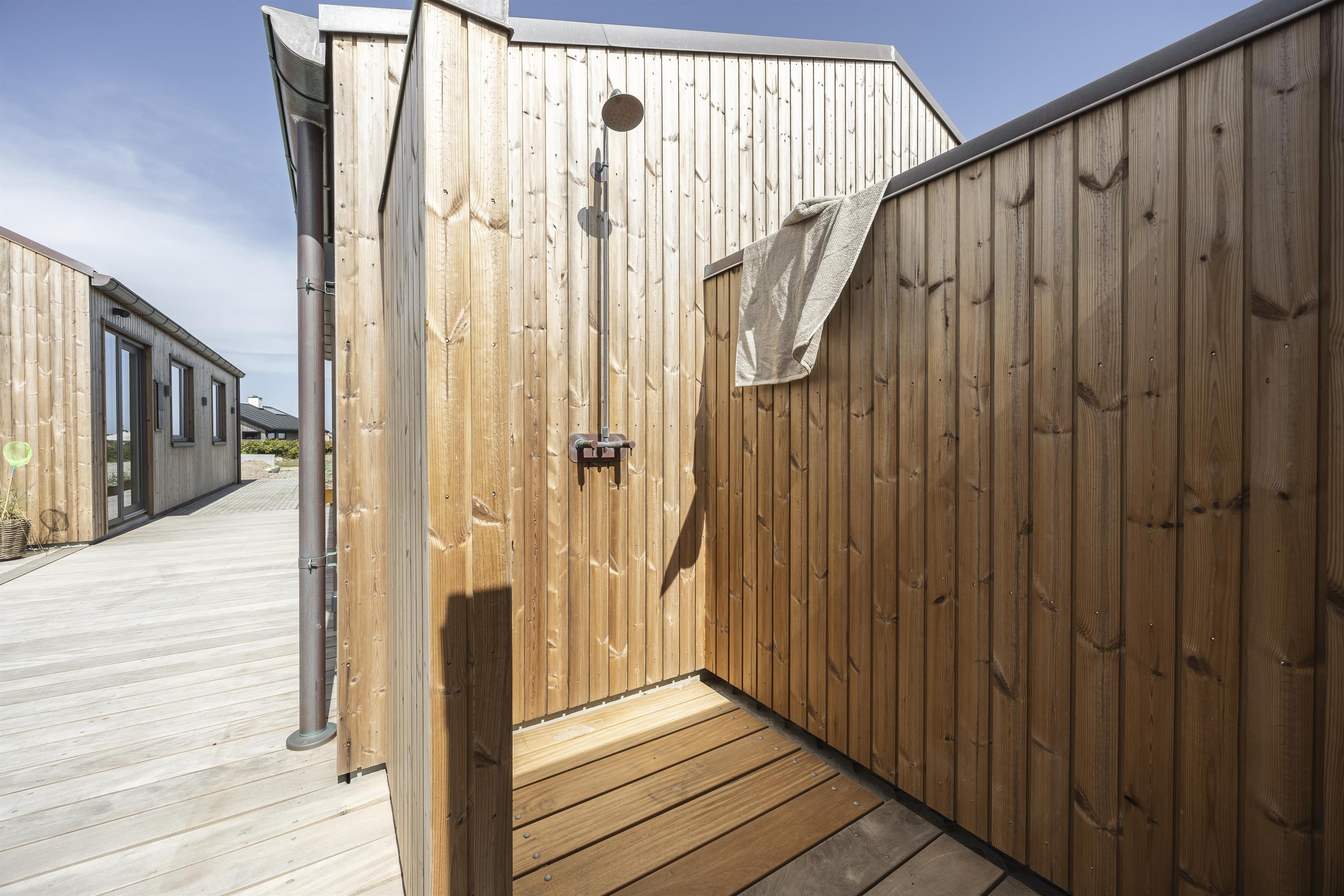 Rund um das Haus erstrecken sich mehrere großzügige, geschmackvoll gestaltete Terrassen mit Möglichkeiten für Sonne und Schatten den ganzen Tag über. Die überdachte Terrasse mit Loungemöbeln und Heizstrahler lädt zu langen Abenden unter dem Himmel der Westküste ein. Auch an die Kleinsten wurde gedacht: mit Sandkasten, einem kleinen Ballspielfeld mit stoßdämpfendem Bodenbelag und einer praktischen Außendusche für salzige Haut und sandige Füße nach dem Strandbesuch.