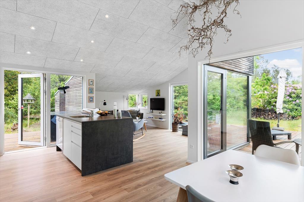 Im Inneren empfängt Sie eine warme und freundliche Atmosphäre mit großen Fensterfronten und offener Decke, die für Helligkeit und ein großzügiges Raumgefühl sorgen. Das Haus ist hell eingerichtet, mit charmanten Details und einem persönlichen Stil, der sofort ein Gefühl von Zuhause vermittelt. Die gut ausgestattete Küche ist offen zur gemütlichen Wohnstube hin – ideal für gesellige Ferientage, an denen gekocht, gespielt oder einfach nur geplaudert wird. Egal, ob Sie stille Stunden mit einem Buch oder gemeinsames Beisammensein mit der Familie bevorzugen – hier finden Sie den idealen Rahmen dafür.