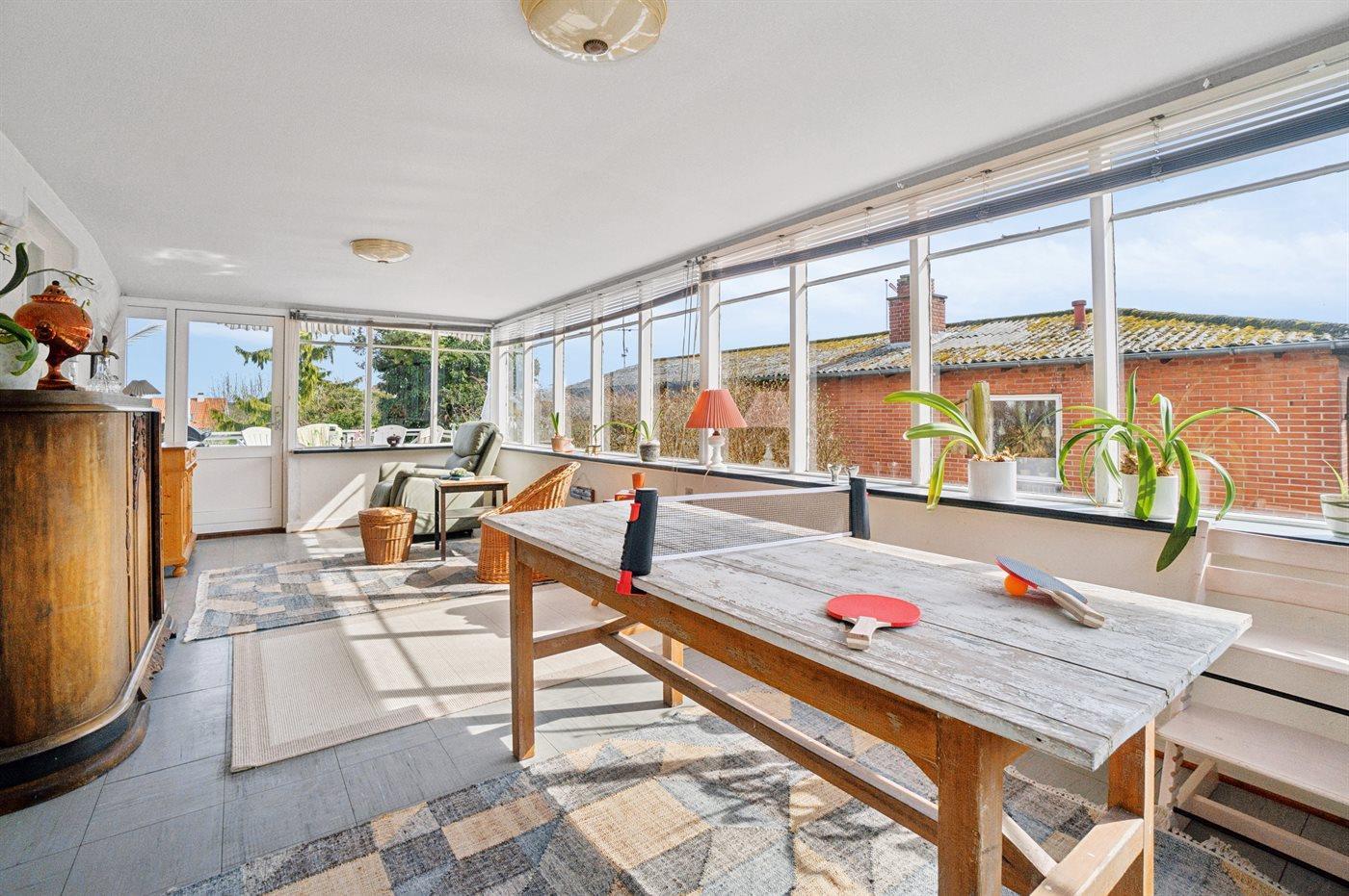 Am Ende des Wintergartens findest du eine erhöhte Holzterrasse, die sich ideal für ein Mittagessen oder des Nachmittagskaffee anbietet – von hier aus kannst du die Kinder im Blick behalten, während sie im ruhigen Garten spielen.
