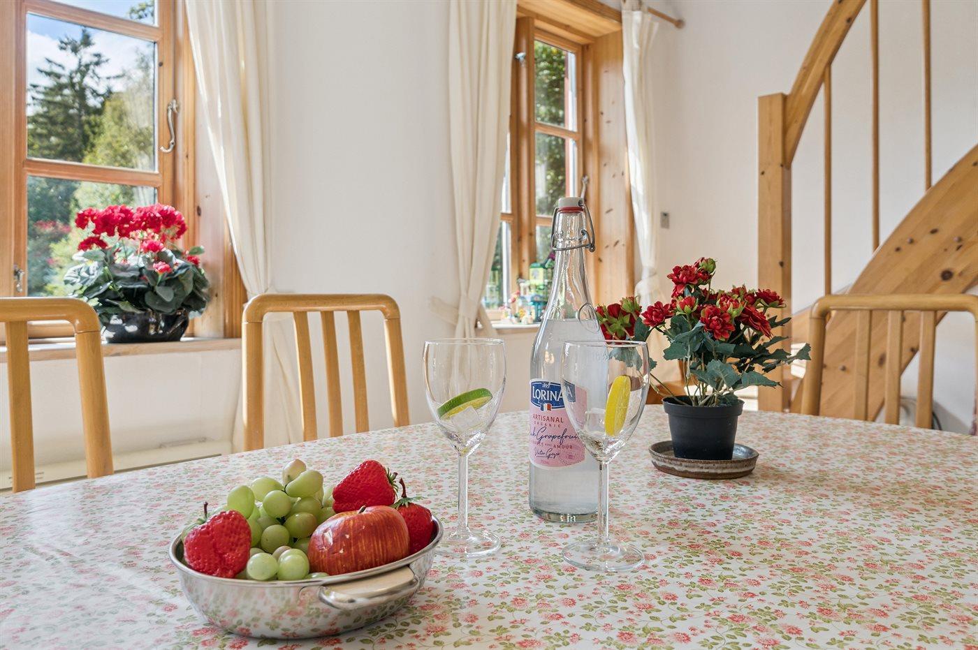 Das Haus erstreckt sich über zwei Etagen, und im Gästehaus auf der anderen Seite des Hofes befindet sich ein neuer Schlafbereich. Wenn ihr Ruhe und Erholung sucht, dann ist dieses Haus genau das Richtige – abgeschieden, und dennoch nicht weit von Årsdale oder Svaneke entfernt.