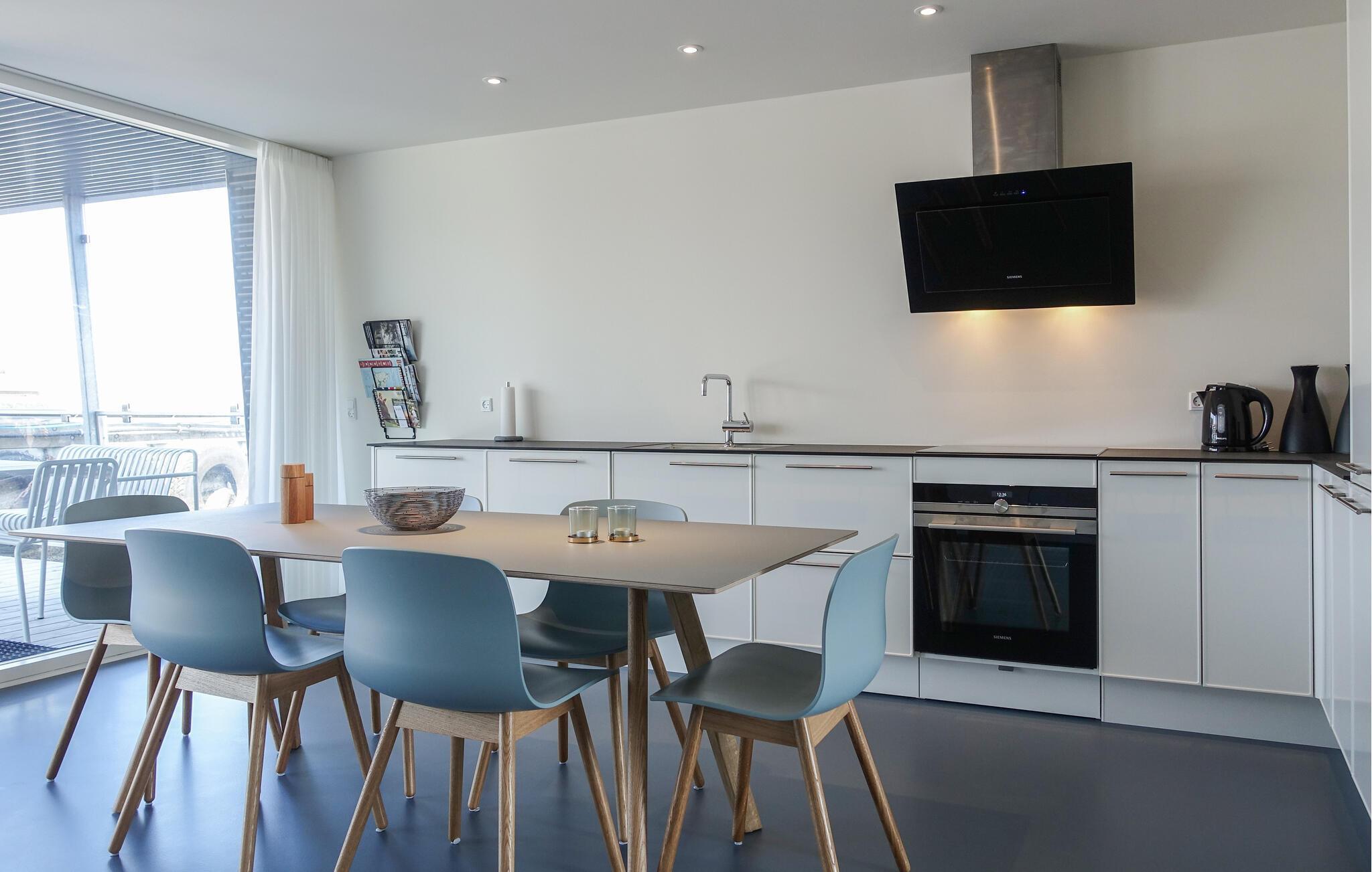 Dieses moderne und geschmackvoll eingerichtete Urlaubsdomizil auf dem Wasser lädt Sie zu einer erholsamen Auszeit ein. Bereiten Sie in der offenen, voll ausgestatteten Küche frische Köstlichkeiten zu und genießen Sie Ihre Mahlzeiten am großzügigen Esstisch. Lassen Sie sich auf den bequemen Sofas nieder und genießen Sie das maritime Ambiente – ob bei einer spannenden Serie auf dem Smart-TV oder bei einem guten Buch.