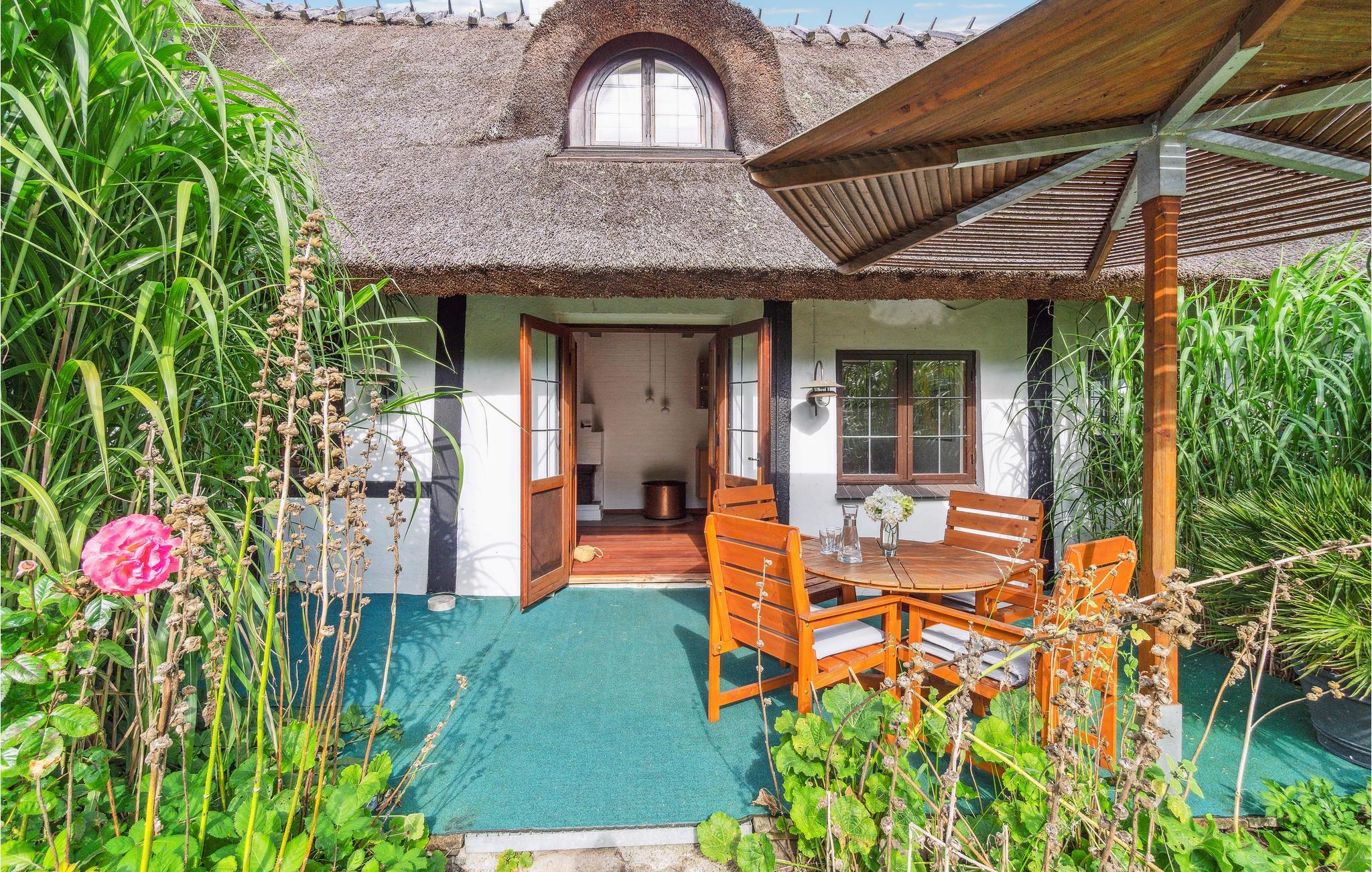 Charmantes reetgedecktes Fachwerkhaus mit Kamin, Meerblick und Garten nahe Nexø bietet gemütliche Atmosphäre und Ruhe.