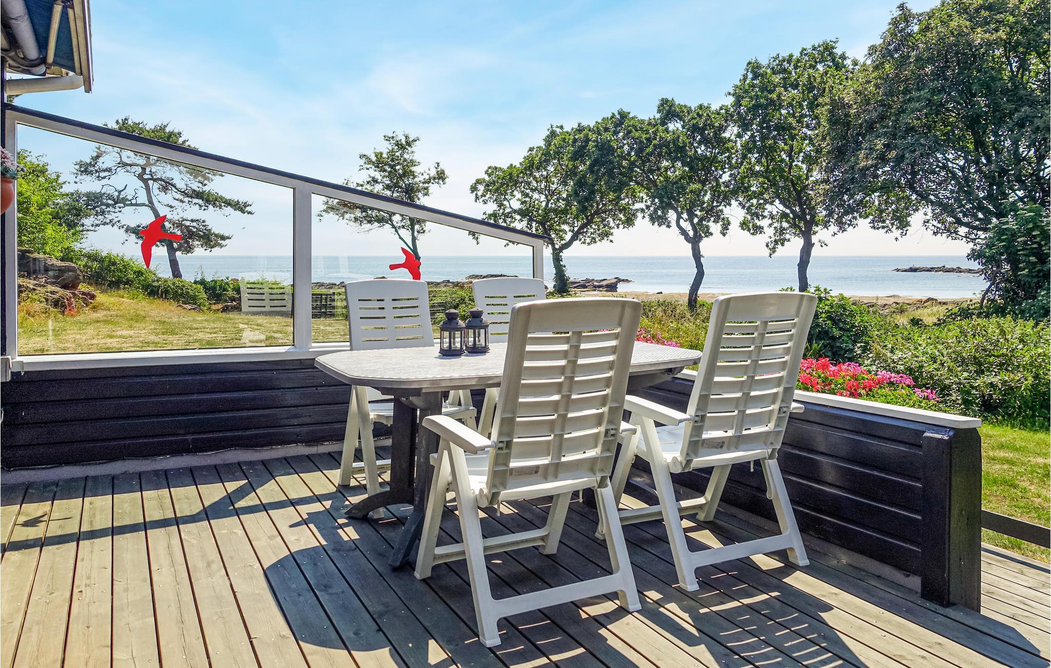 Gemütliches Holzhaus mit Meerblick, großer Terrasse und idyllischer Lage an der felsigen Küste in Dänemark.