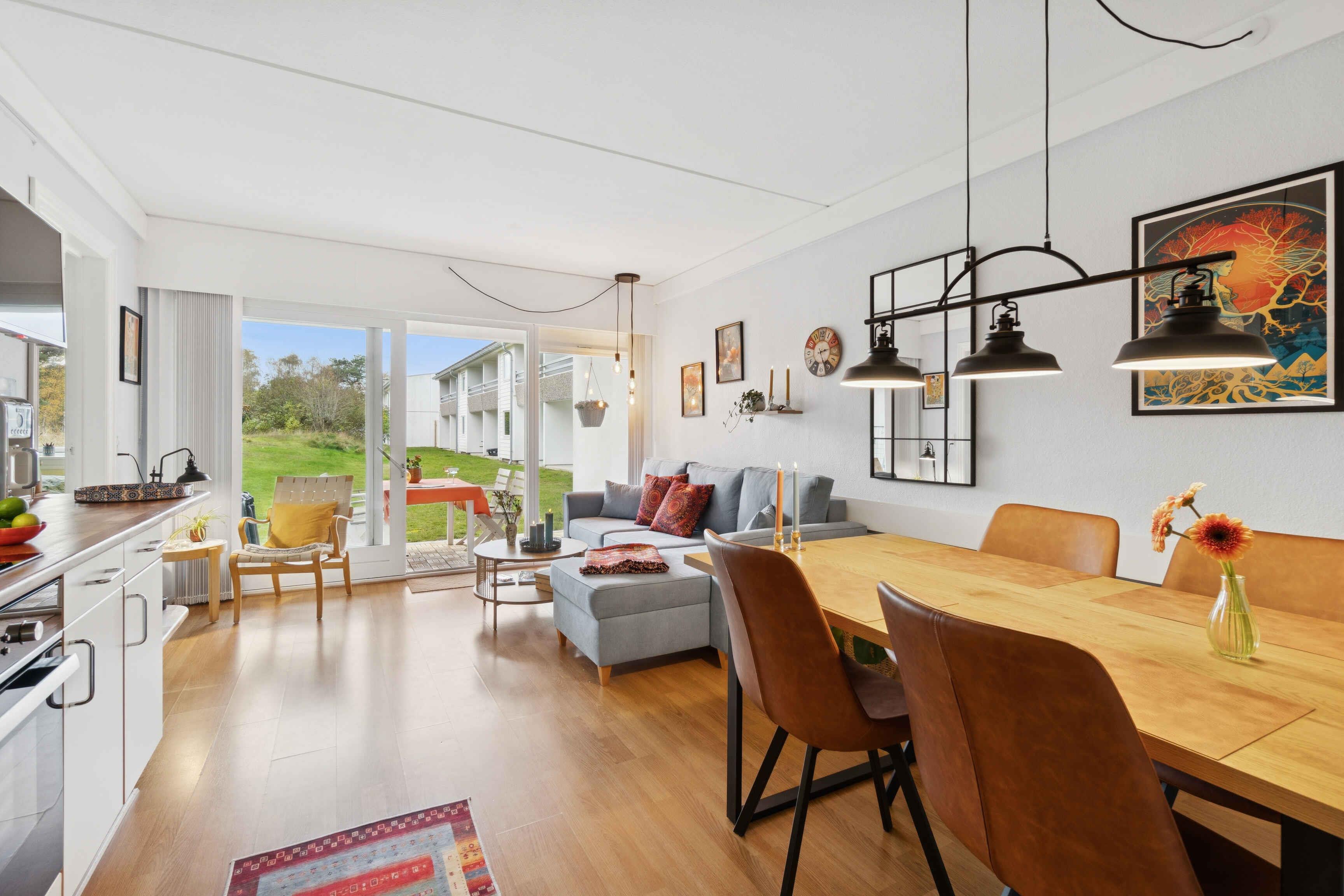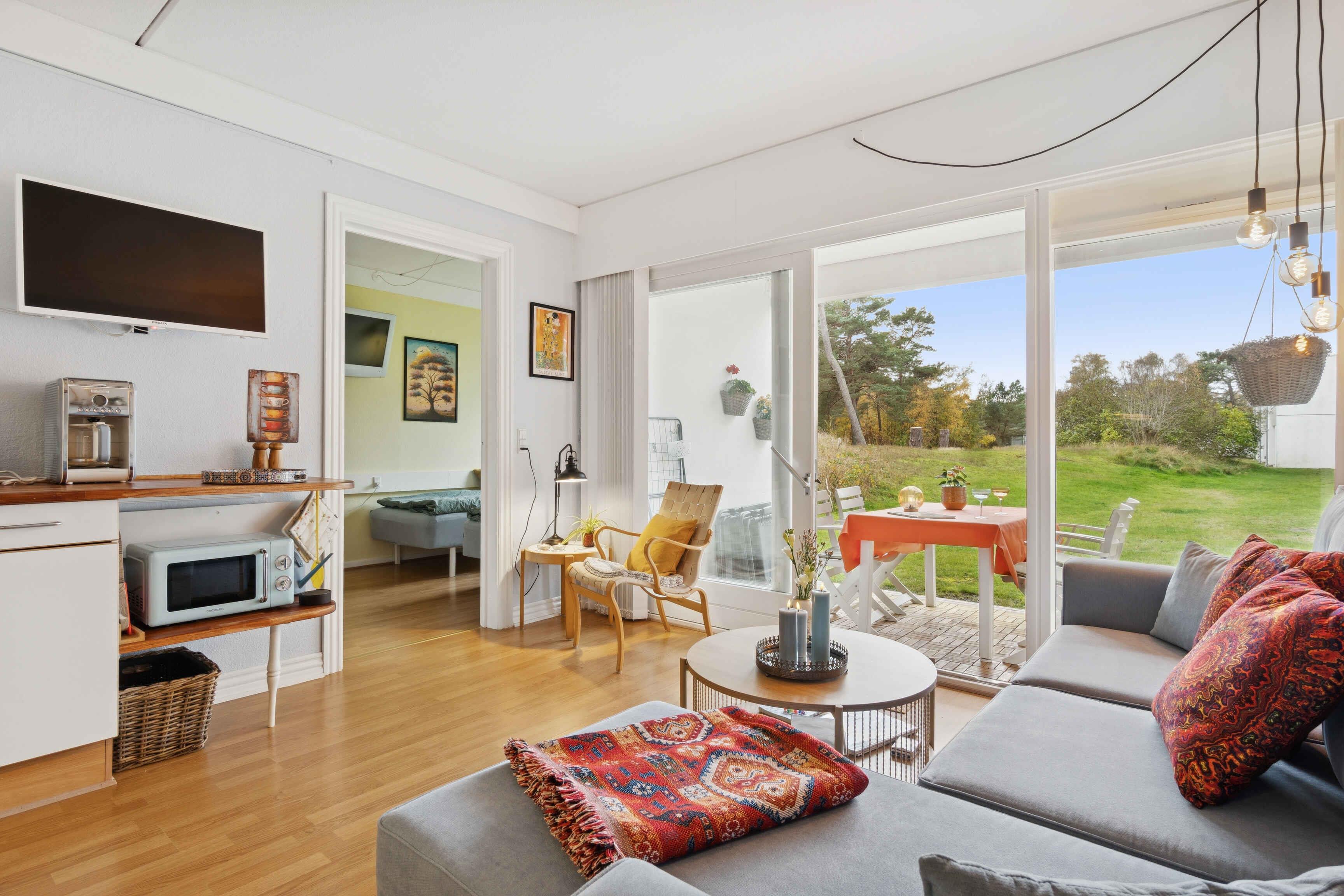 Helles Apartment in Dueodde mit einem Schlafzimmer und vier Schlafplätzen. Offener Wohnbereich, gut ausgestattete Küche und Terrasse. Nahe Strand und Natur. Ideal für Paare und kleine Familien.
