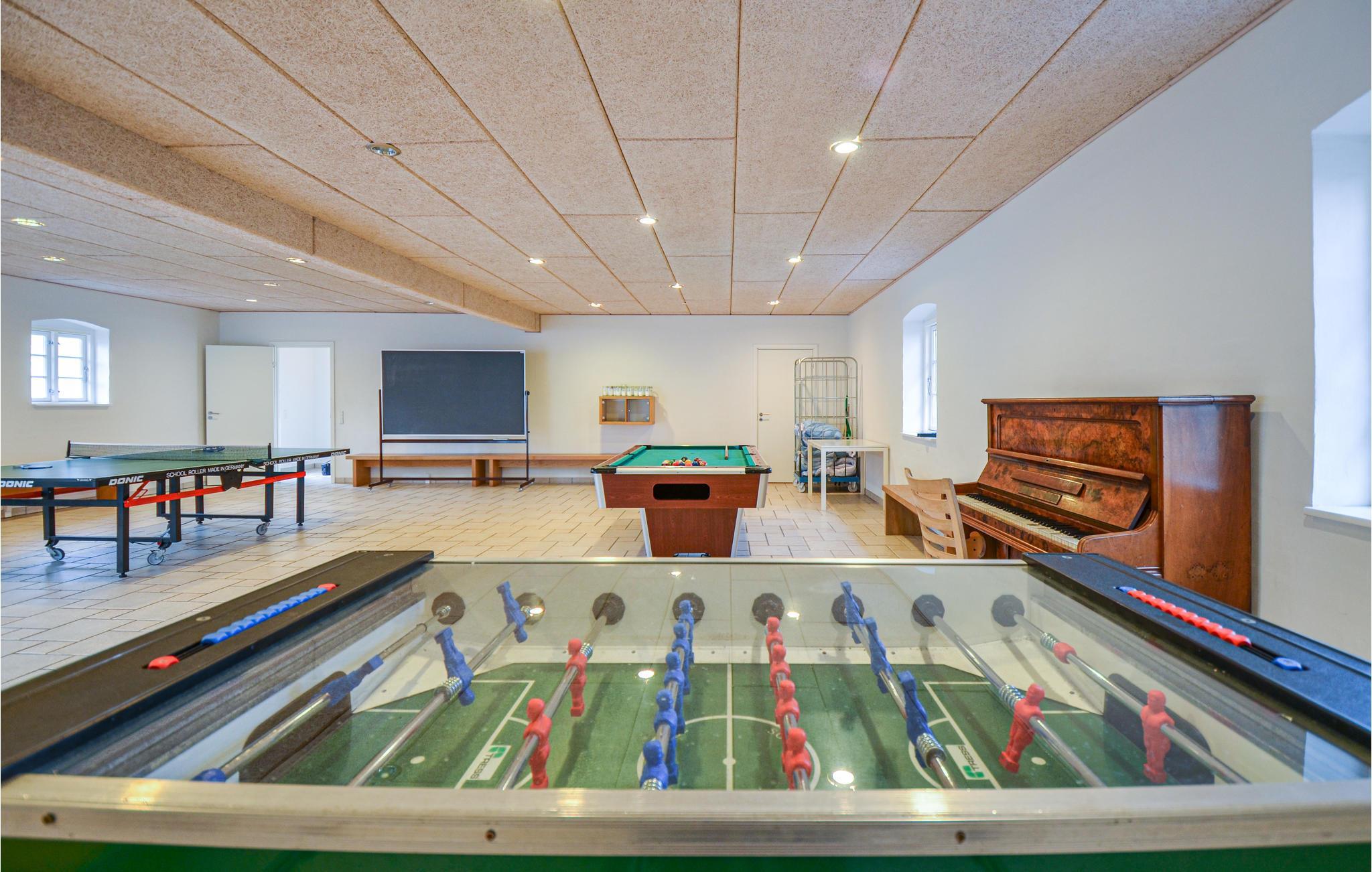 Nutzen Sie die große Terrasse zwischen Haupt- und Nebengebäude für gemeinsame Grillabende. Spielen Sie Tischtennis, Kicker oder Billard im Aktivitätsraum oder lassen Sie Ihre Kinder auf dem Spielplatz mit Rutsche und Schaukel spielen. Der Garten bietet viel Platz zum Toben und ein Fußballtor sorgt für zusätzlichen Spielspaß.