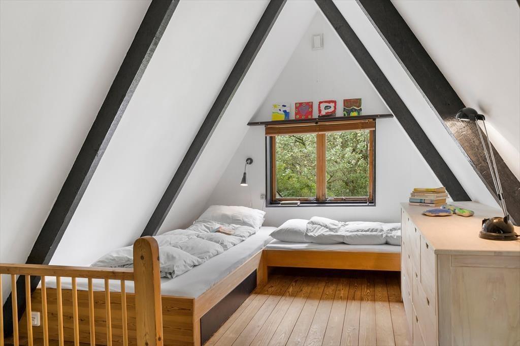 Ein weiterer Ausgang führt dich auf eine überdachte Terrasse an der Ostseite, sodass du dich zu jeder Zeit zwischen einem sonnigen und einem geschützten Aufenthaltsplatz entscheiden kannst. Der Anbau des Hauses ist von der Küche aus zugänglich. Er beinhaltet einen gemütlichen Aufenthaltsraum, von dem eine doppelte Terrassentür leichten Zugang zu einer gen Nordwesten weisenden Terrasse ermöglicht. Die großen Terrassentüren schaffen eine wunderbare Verbindung zur umliegenden Natur. Im Anbau ist darüber hinaus das Badezimmer mit WC und Dusche untergebracht. Das Bad präsentiert sich ebenso gemütlich und funktionell wie der Rest deines Ferienhauses. Über eine Treppe erreichst du den zweiten Schlafraum des Urlaubsdomizils, in dem drei weitere Betten zur Verfügung stehen. Die Aussicht ist in diesem Schlafraum wunderschön. Durch das Fenster blickst du weit über das Naturgebiet Nordby Bakker. Zudem verwöhnt das Fenster mit einem reizvollen Tageslichteinfall. Bei diesem Ferienhaus handelt es sich um ein ganz besonderes Exemplar, das mit einem Maximum an Charme und Nostalgie verzaubert. Es bietet Platz für bis zu sechs Personen und begeistert mit seiner traumhaft schönen Lage. Unvergessliche Urlaubserlebnisse sind dir und deinen Lieben bei diesem Ferienhaus garantiert.