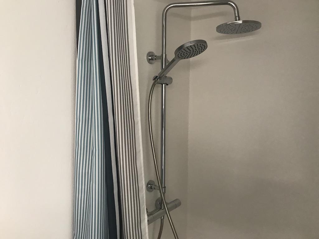 Das schöne Badezimmer verfügt über eine Dusche und eine Bodenheizung. Es gibt sowohl eine Waschmaschine als auch einen Trockner.