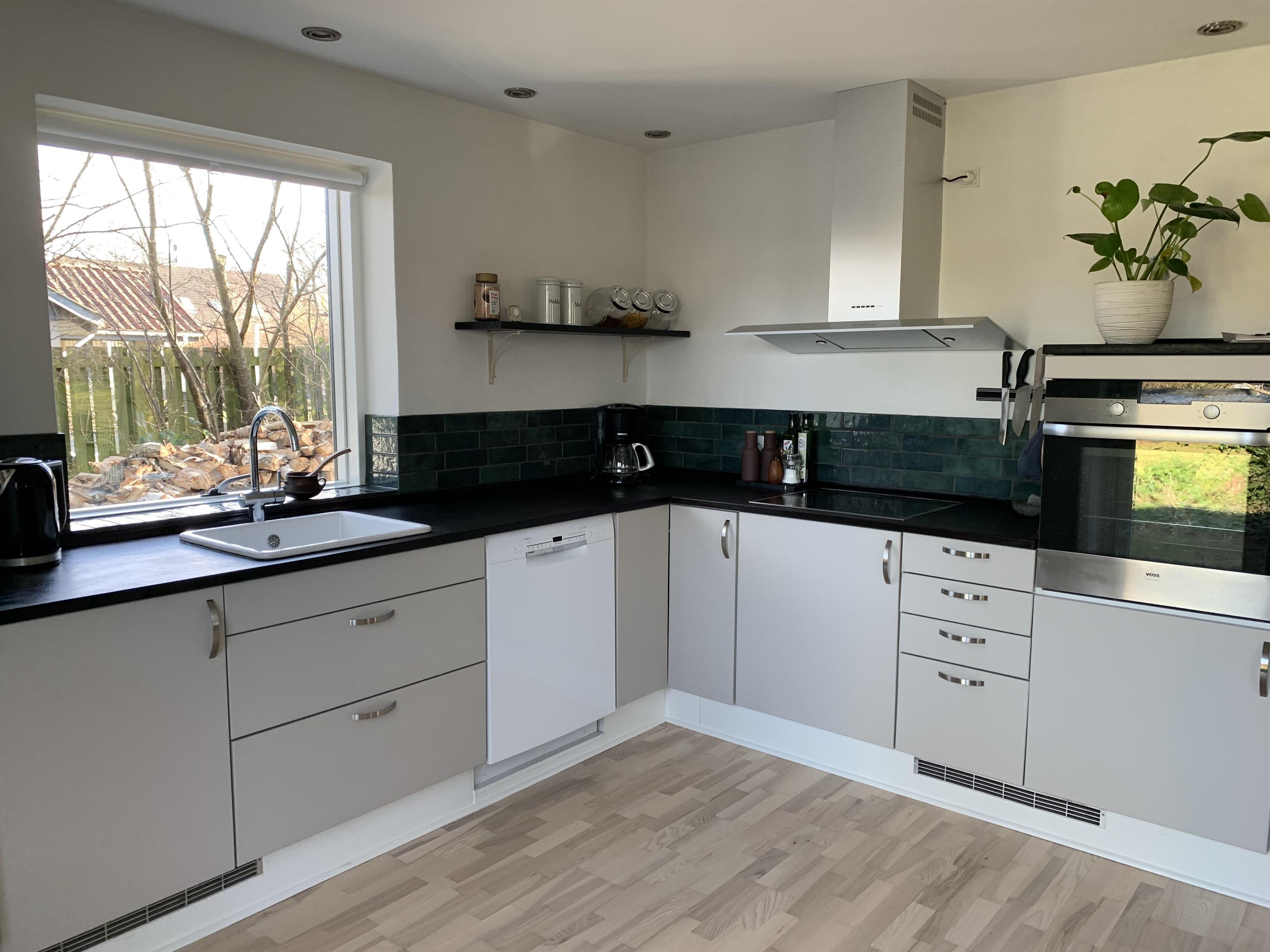 Schöne offene Küche mit eingebautem Backofen und Geschirrspüler. Von der Küche aus haben Sie auch Zugang zum Garten.
