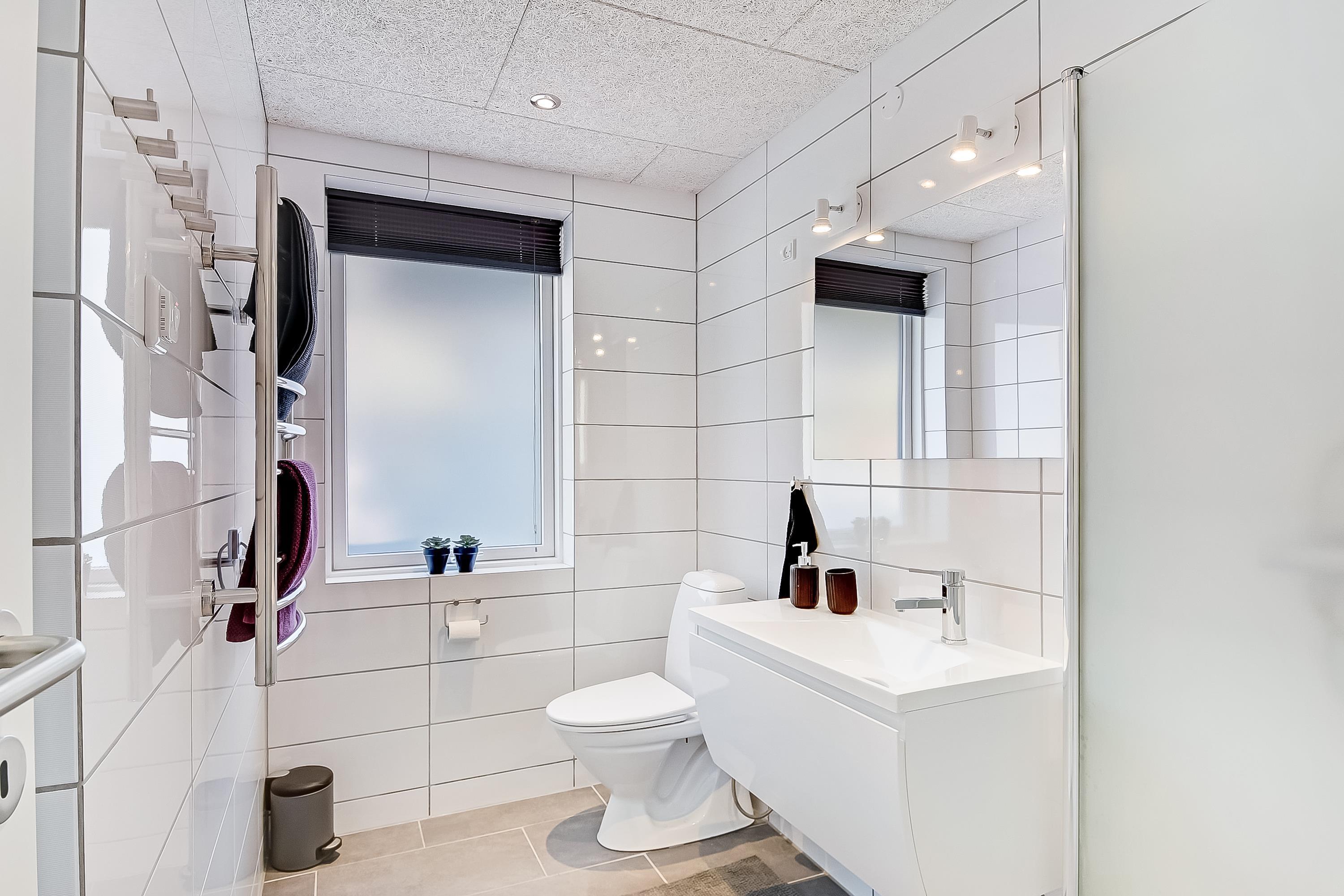 Aufteilung: Heller, modern eingerichteter Wohn-/Essraum mit Panoramafenstern, offener Küche, gutem Kaminofen und Fjordblick. Insgesamt 3 Schlafzimmer, eines mit Doppelbett, eines mit zwei Einzelbetten und eines mit einem Einzelbett. Die Betten sind variabel, d.h. das Doppelbett kann leicht zu 2 Einzelbetten umfunktioniert werden und umgekehrt. Schönes, modernes Bad mit großer Duschnische und Handtuchtrockner. Fußbodenheizung in Bad, Hauswirtschaftsraum und Schlafzimmern.