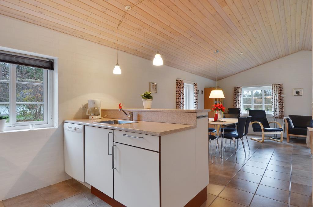 Das Ferienhaus ist mit viel Liebe zum Detail eingerichtet und besticht durch eine helle, freundliche und gemütliche Atmosphäre. Das geschmackvoll eingerichtete Wohnzimmer ist offen mit der gut ausgestatteten Küche verbunden – hier gibt es viel Platz für gemeinsames Kochen und schöne Stunden zusammen. Große Fenster sorgen für reichlich Licht und bieten einen schönen Blick auf das grüne Umfeld, während der Kaminofen an kühleren Tagen für zusätzliche Gemütlichkeit sorgt.