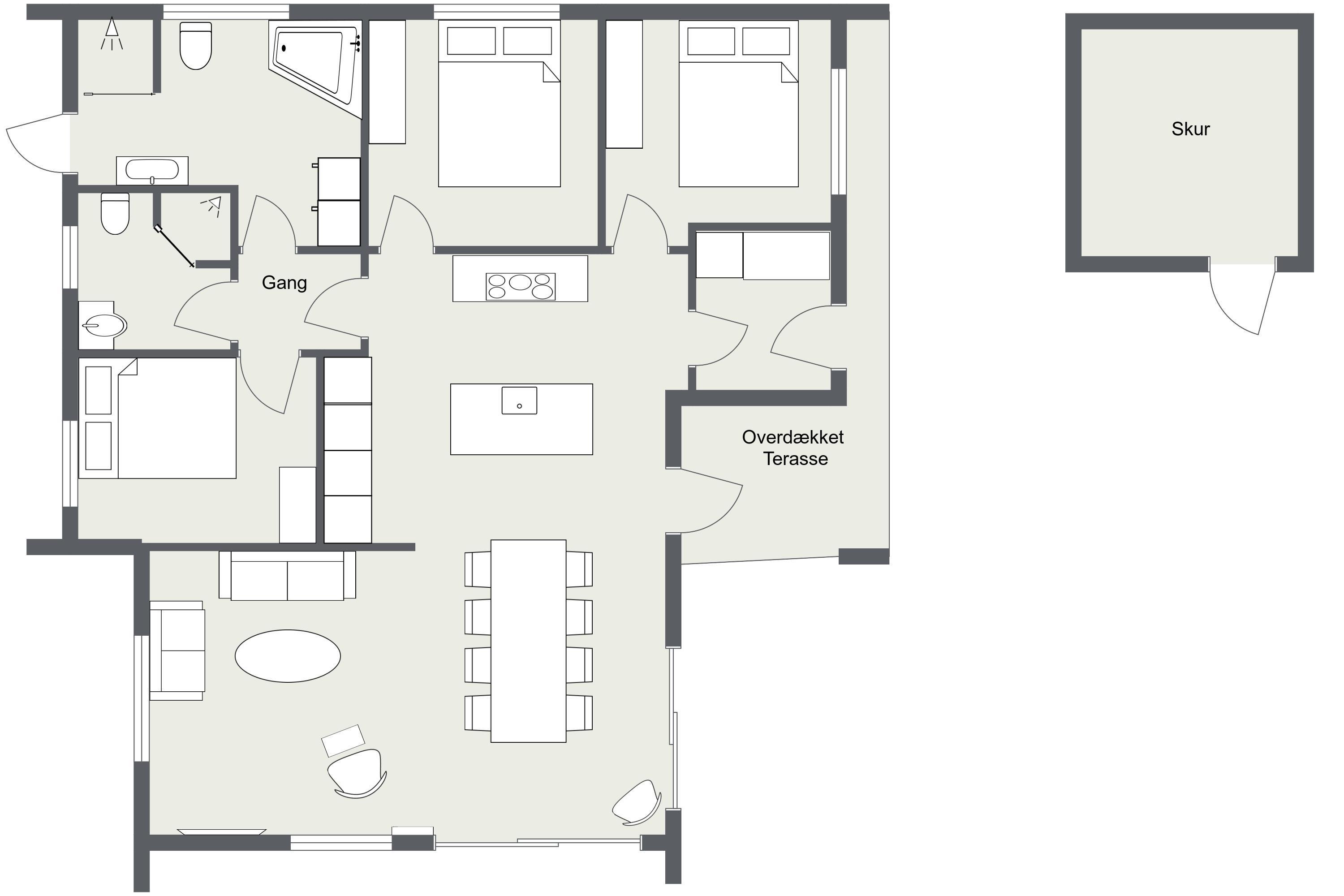 Das Haus verfügt über drei komfortable Schlafzimmer – zwei mit Doppelbett und eines mit einem ¾-Bett sowie zwei Etagenbetten, die besonders bei Kindern beliebt sind. Zwei moderne Badezimmer mit Dusche und WC stehen zur Verfügung, eines davon zusätzlich mit Badewanne und direktem Zugang zur Terrasse – sehr praktisch nach einem Strandtag, um den Sand einfach abzuspülen.