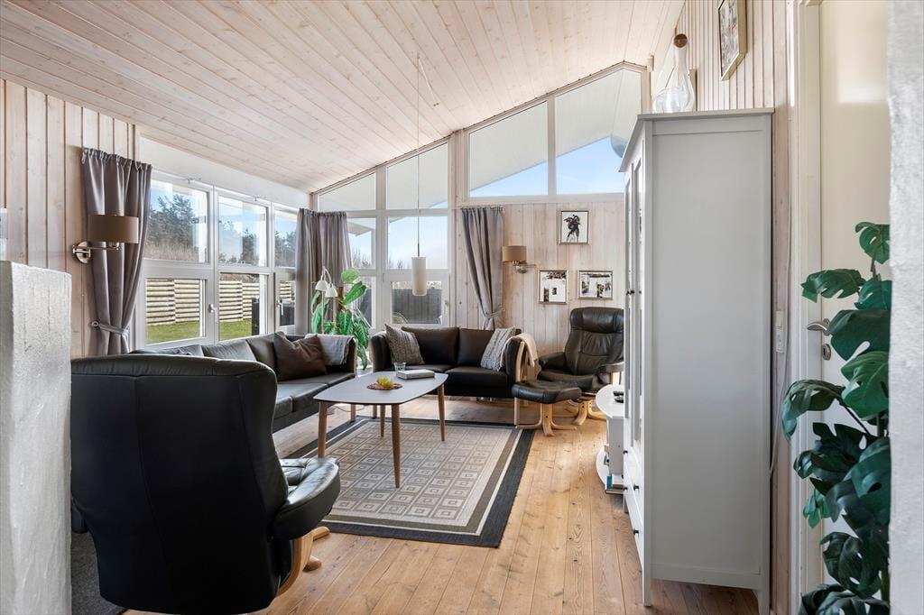 Die ganze Familie kann mitmachen, denn Groß und Klein fühlen sich in dem 118 m² großen Ferienhaus wohl. In den drei Schlafzimmern gibt es insgesamt sieben Schlafplätze – und außerdem Matratzen im Dachboden, die ihr als alternative Schlafplätze oder gemütliche Kuschelecken nutzen könnt. Es gibt auch viel Platz, um es sich im hellen Wohnbereich des Hauses gemütlich zu machen, wo eine gut ausgestattete Wohnküche offen mit einem Wohnzimmer verbunden ist, das mit einem Kaminofen, bequemen Sitzmöbeln und einem Fernseher mit Chromecast lockt. Vom Wohnzimmer führt der Weg in einen schönen Wintergarten, der mit großen Fenstern ausgestattet ist und direkten Zugang zur Terrasse bietet. Wenn ihr Wärme und Entspannung braucht, ist es gut, dass es sowohl einen Whirlpool als auch eine Sauna im größten der beiden Badezimmer des Hauses gibt.
