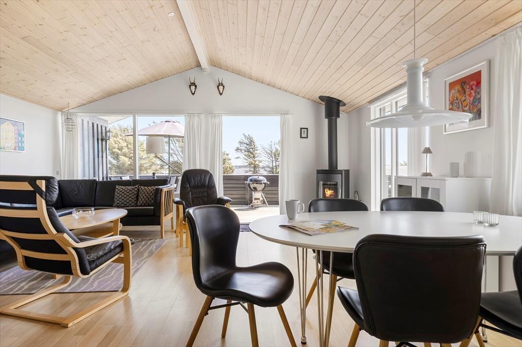 Im Inneren des Ferienhauses empfängt dich eine helle und freundliche Atmosphäre, in der die gemütliche Einrichtung für eine besondere Ruhe sorgt. Es fällt leicht, sich mit einem guten Buch auf dem Sofa oder einer Tasse Kaffee am Esstisch wohlzufühlen, während die Sonne durch die Fenster scheint. Wohnzimmer und Küche gehen offen ineinander über und bilden einen harmonischen Wohnbereich, in dem der Kaminofen an kühleren Abenden für wohlige Wärme sorgt – mit knisterndem Feuer und echter Urlaubsstimmung in der Luft. Man kann sich lebhaft vorstellen, wie hier beim Abendessen fröhlich geplaudert wird, während draußen das Licht langsam schwindet und Platz macht für gemeinsame Spiele, Lachen und echte Nähe. Die ruhige Umgebung und das schlichte Interieur helfen dir dabei, völlig abzuschalten und den Alltag hinter dir zu lassen.