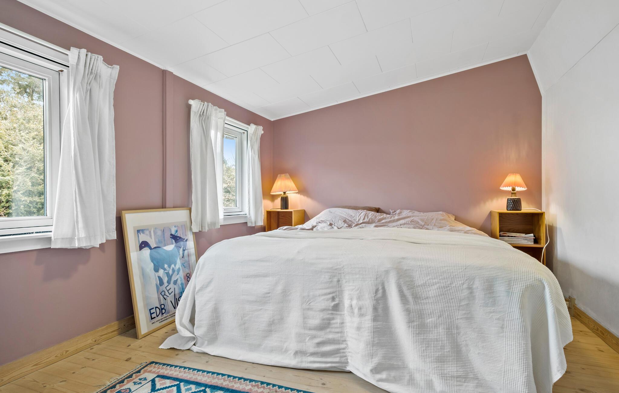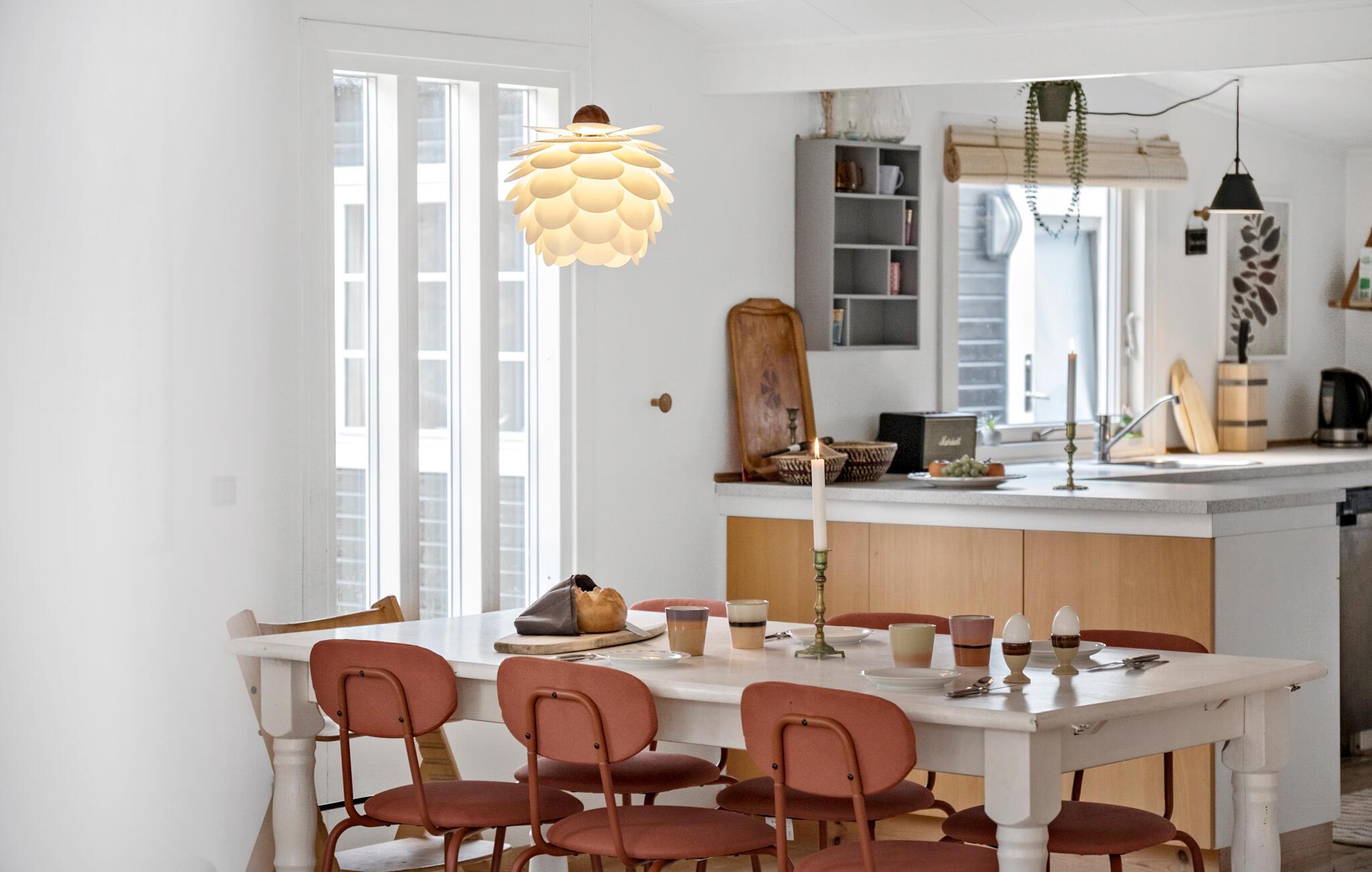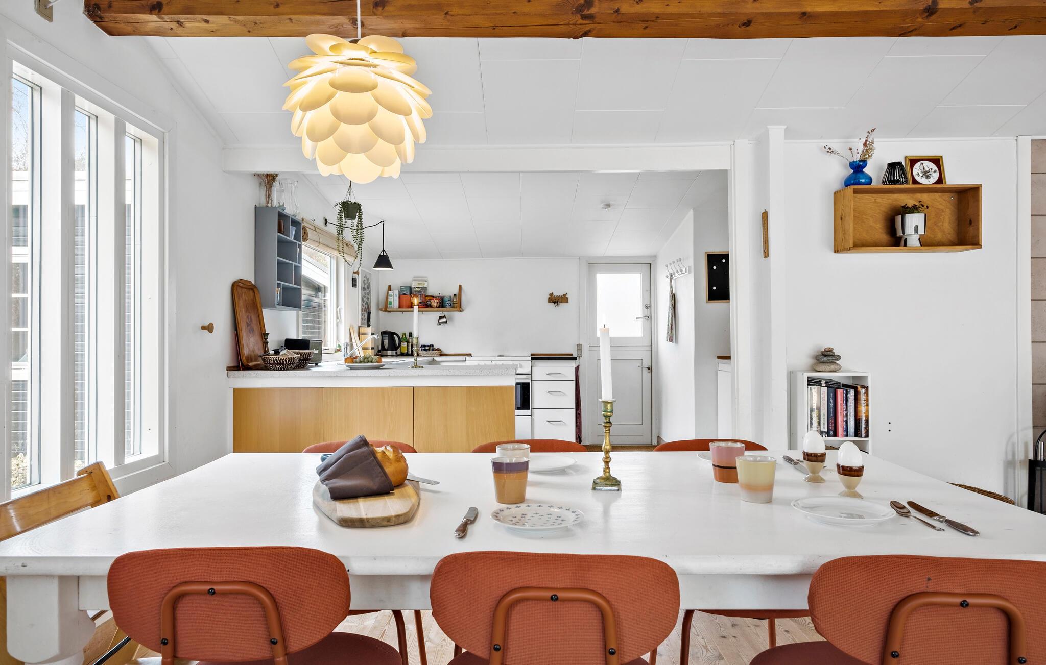 Auf einem schönen Naturgrundstück gelegen begrüßt Sie Ihr Ferienhaus zu Entspannung pur und dänischer Hygge. Das Haus besticht durch eine Mischung aus schlichter skandinavischer Ästhetik und gemütlicher Holzakzente. Freuen Sie sich morgens auf das gemeinsame Familienfrühstück am Esstisch, das Sie in aller Ruhe in der geräumigen Küche zubereiten können. Im Wohnbereich laden mehrere Sofas zu geselligen Stunden ein. Machen Sie es sich mit einem guten Buch gemütlich, malen Sie mit Ihren Kindern oder lösen Sie ein kniffliges Kreuzworträtsel. Hier haben Sie alle Zeit der Welt. Das natürliche Licht, das durch die großzügigen Fenster einfällt, unterstreicht die friedliche Atmosphäre.