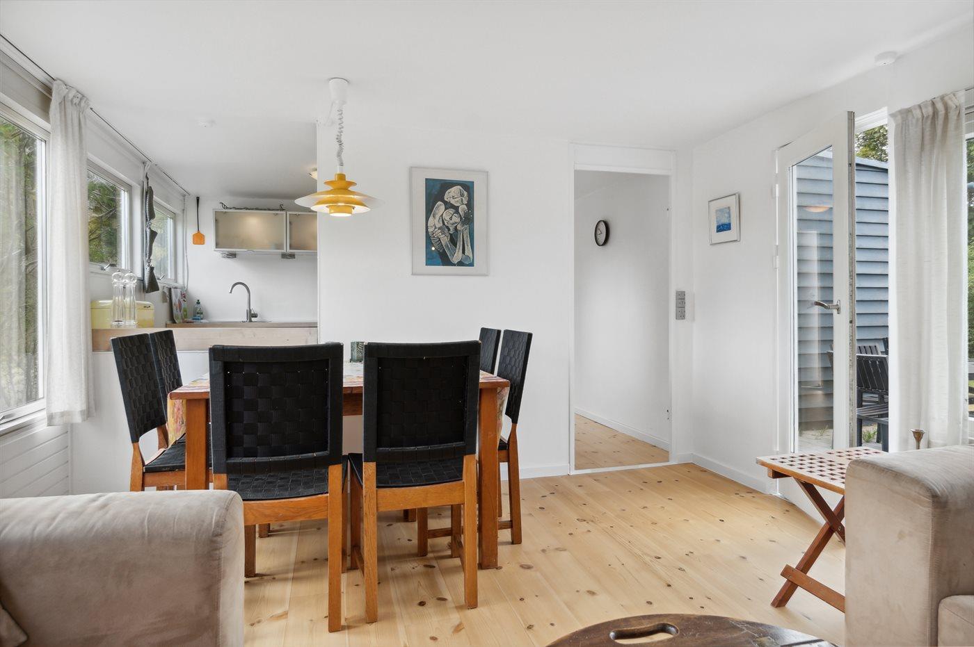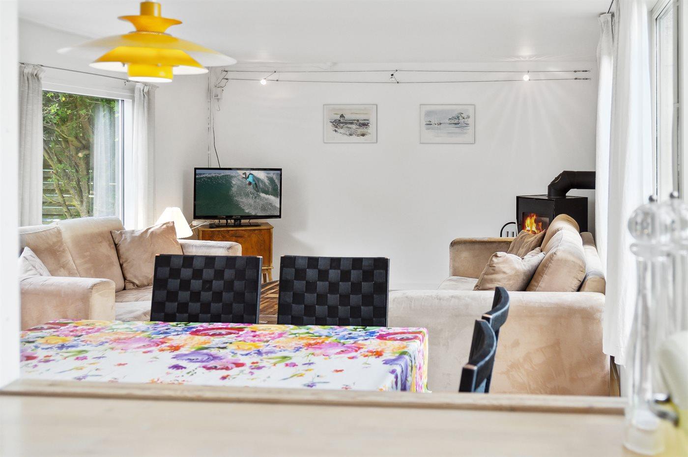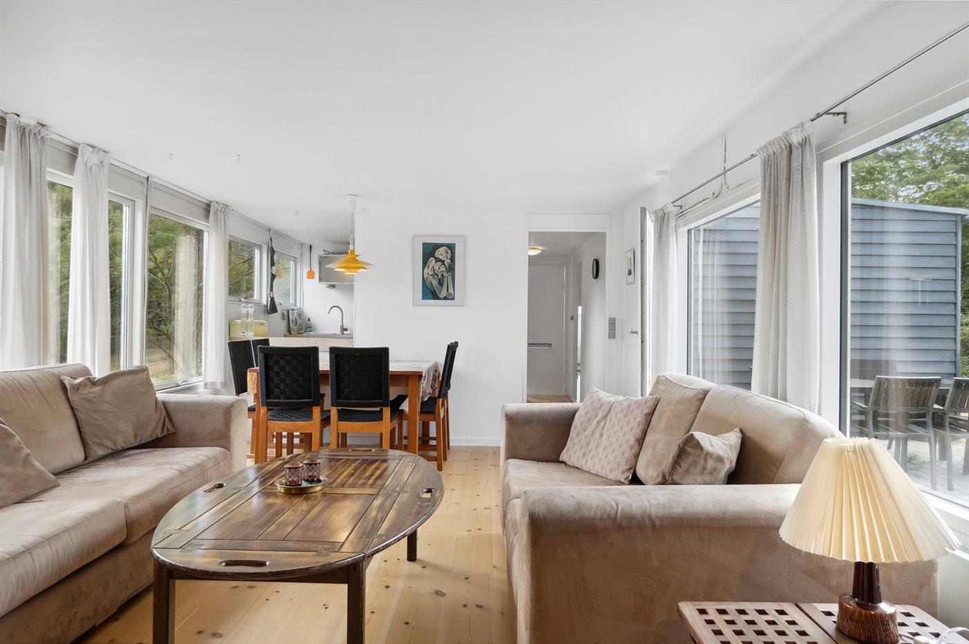 Dieses Ferienhaus aus Holz liegt auf einem Naturgrundstück - nur wenige Minuten Gang vom schönen Sandstrand entfernt. Vom Wohnzimmer gibt es Zutritt zur Terrasse.