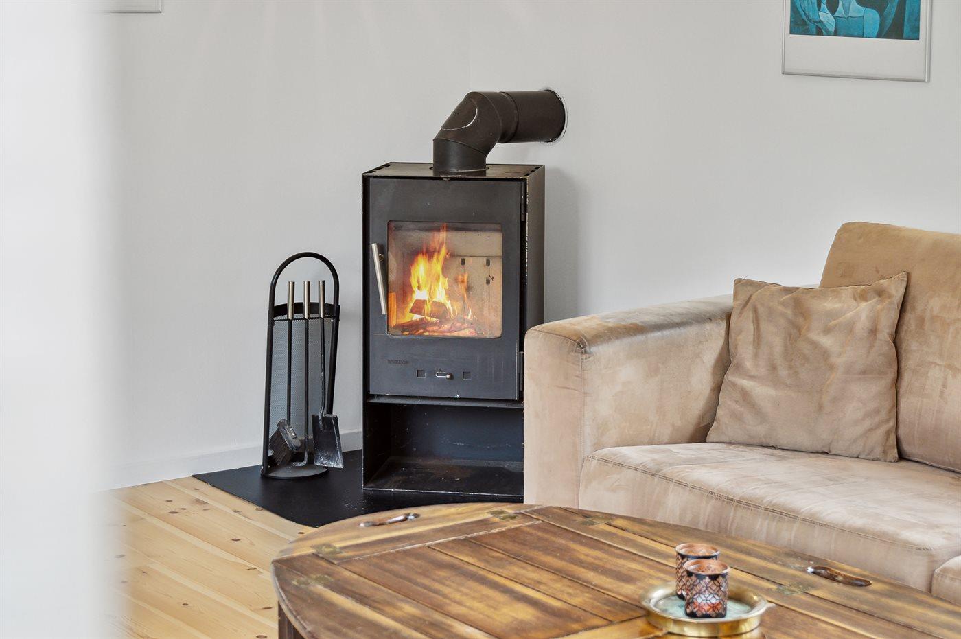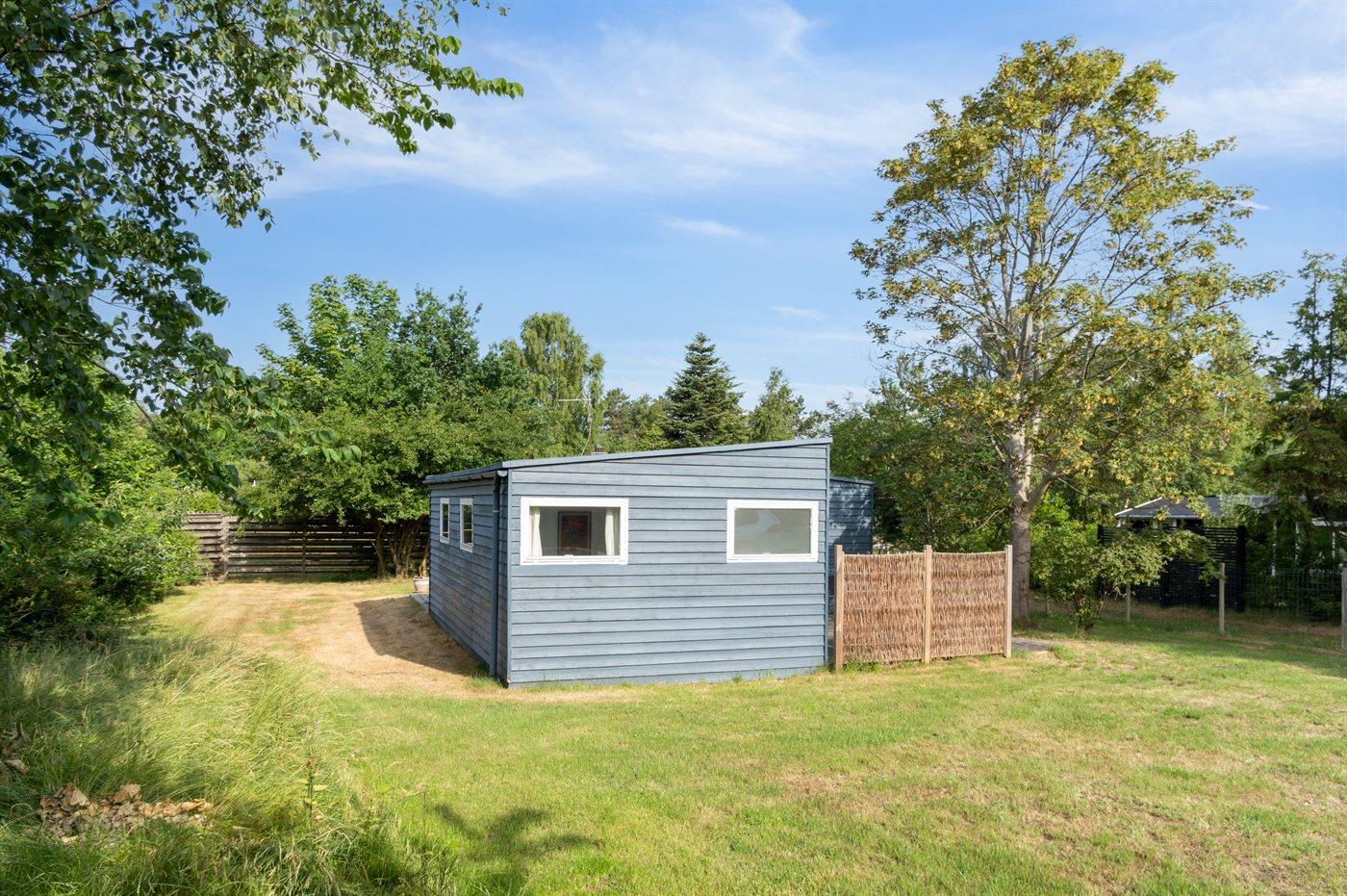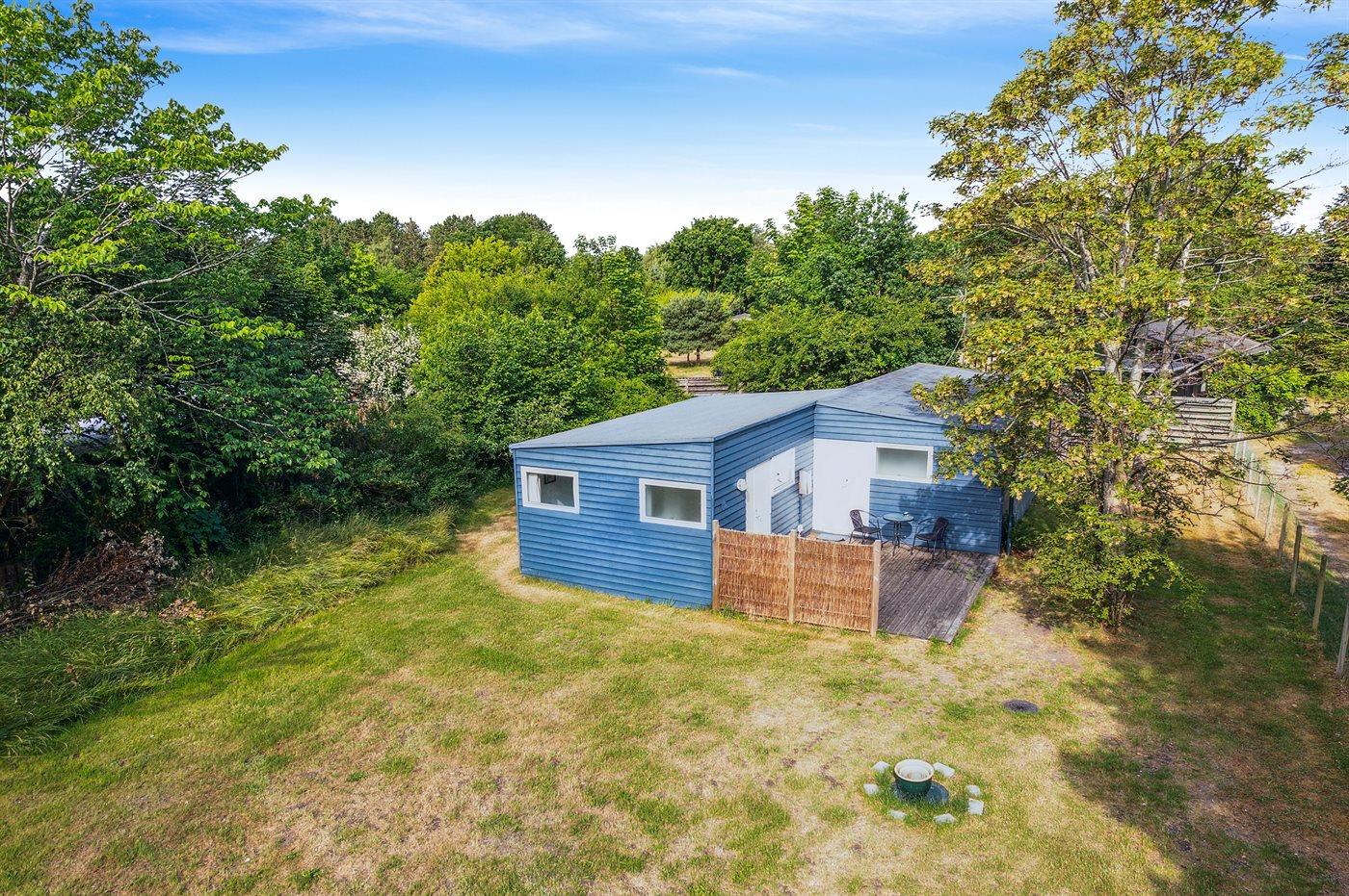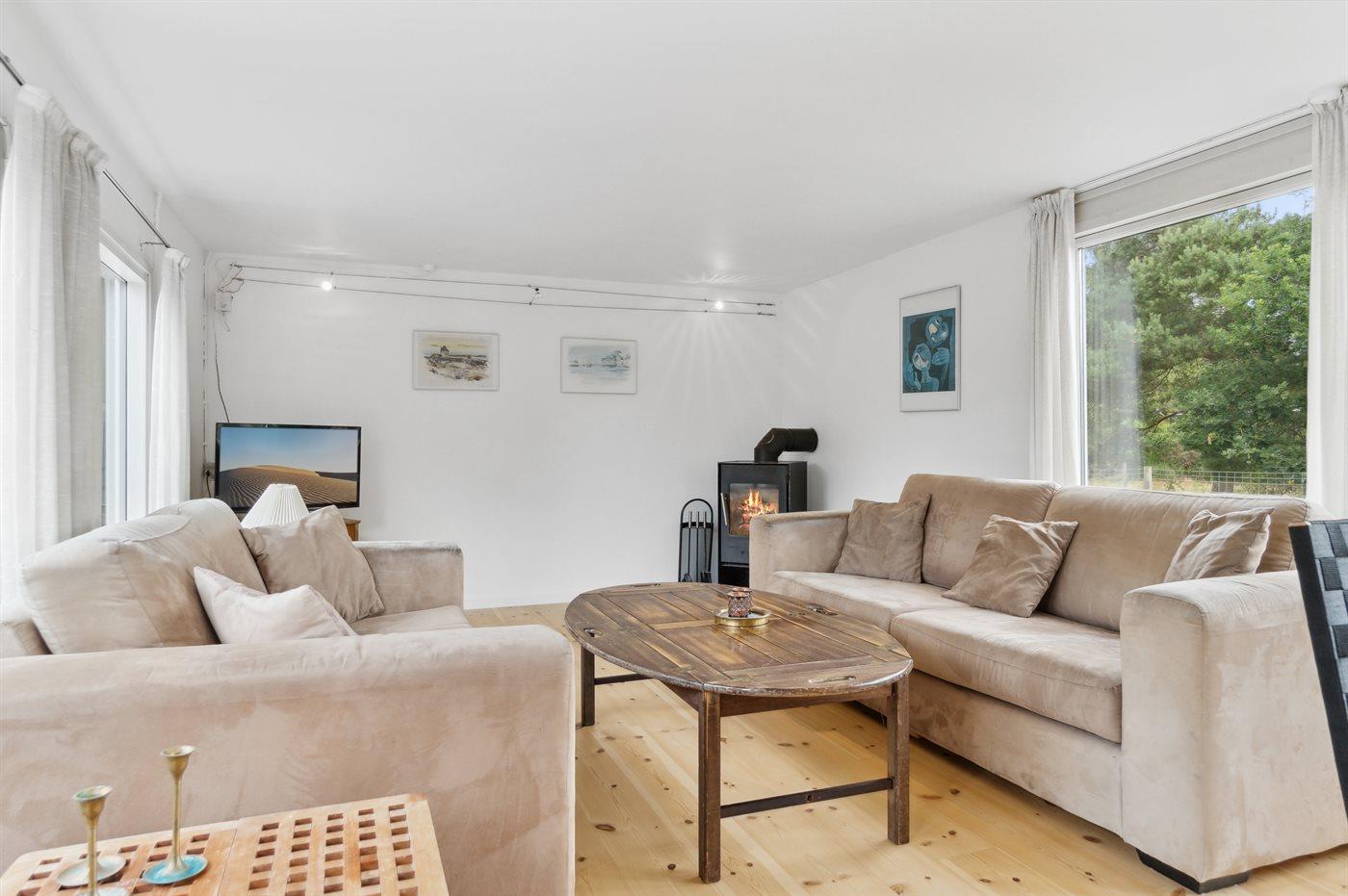 Dieses Ferienhaus aus Holz liegt auf einem Naturgrundstück - nur wenige Minuten Gang vom schönen Sandstrand entfernt. Vom Wohnzimmer gibt es Zutritt zur Terrasse.