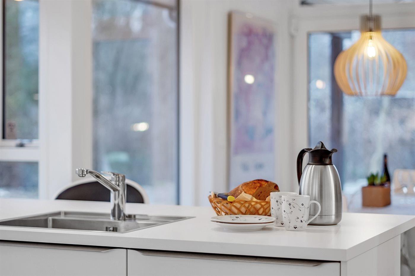 Das Haus wurde 2021 gebaut und ist überall hell mit viel Lichteinfall durch die großen Fensterpartien und viel Luft dank der offenen Dachkonstruktion. Die Einrichtung ist modern und sommerlich.