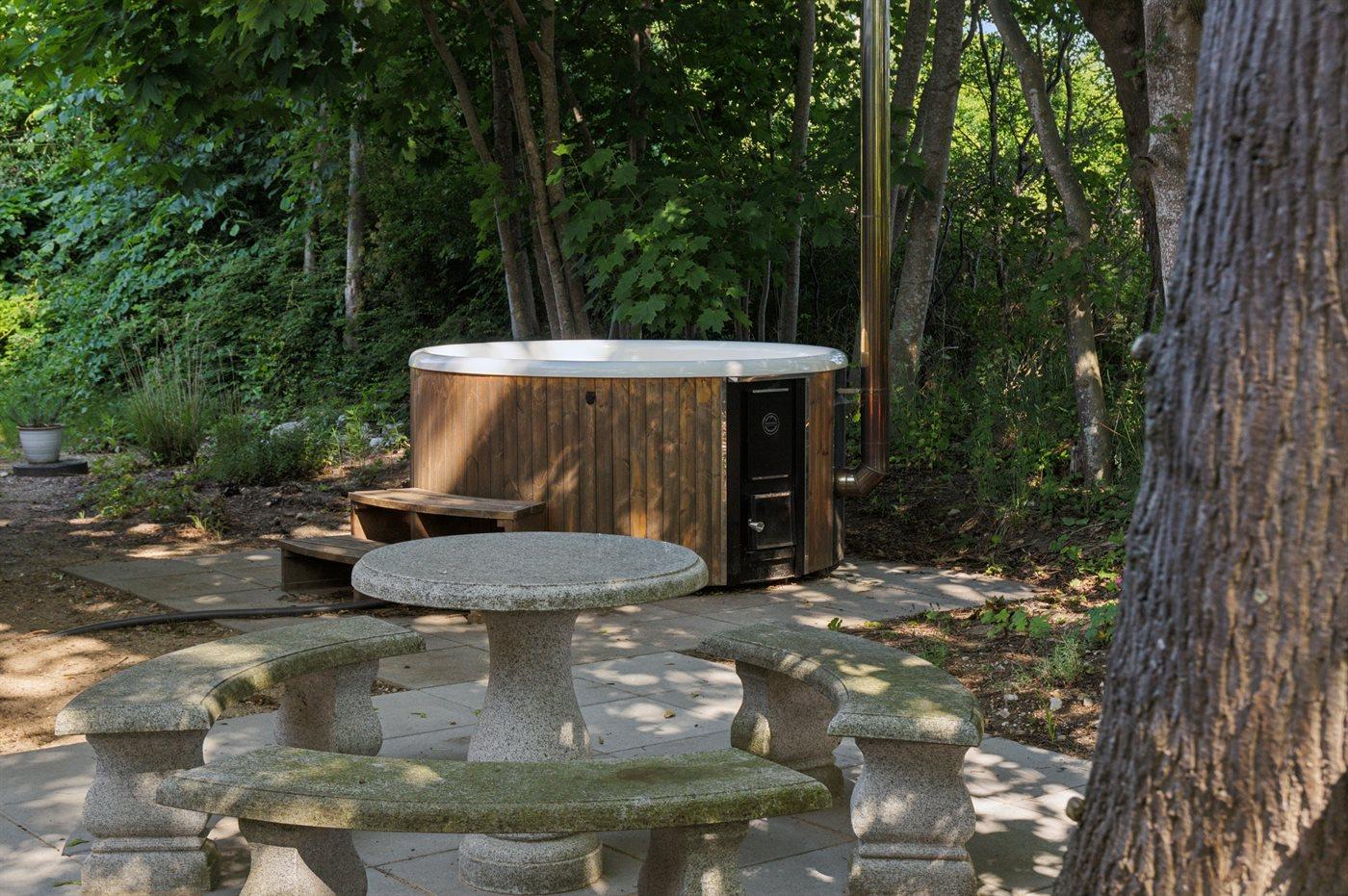 Das große Grundstück ist teilweise Naturgrundstück mit „wilder“ Bepflanzung und teilweise mit Rasenfläche, die viel Platz zum Spielen und Herumtollen mit den Kindern bietet. Der Hot Tub für 6 Personen ist das ganze Jahr über verfügbar, außer bei starkem Frost.