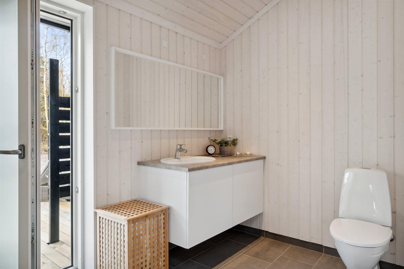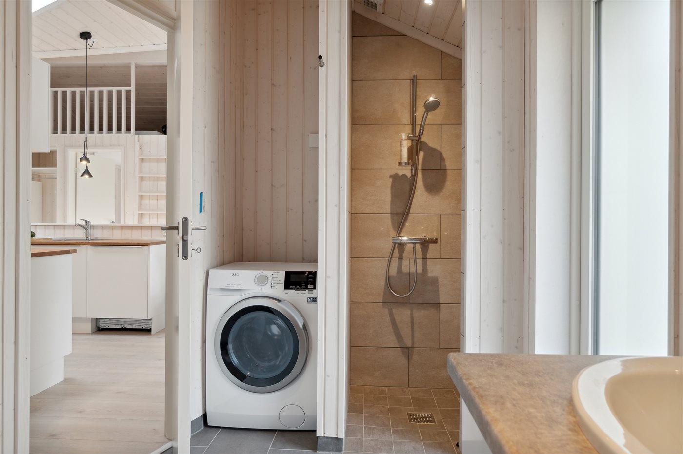 Es gibt 2 schöne Badezimmer mit Fußbodenheizung, Duschnische und einem Waschtrockner (Kombigerät). Von einem Badezimmer gelangen Sie direkt zur Außendusche. Es ist eine Ladesteckdose für Elektroautos vorhanden.