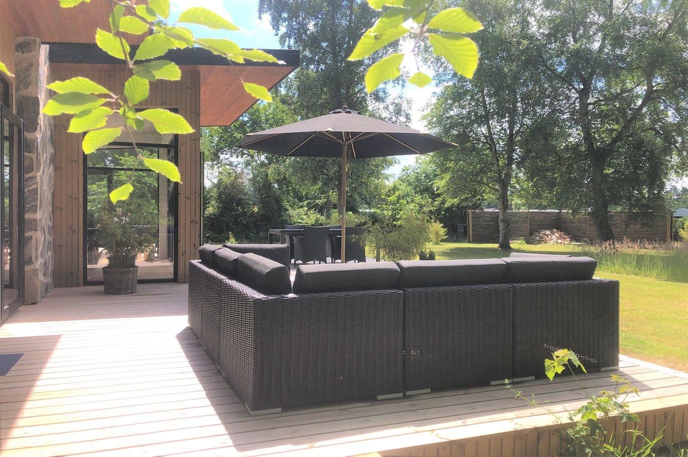 Die herrliche Küche grenzt offen an den Essbereich und das Wohnzimmer an und bildet so einen idealen Treffpunkt für gemütliche Stunden und Beisammensein. Das Haus verfügt über 3 schöne Schlafzimmer, alle mit Doppelbetten, sowie 2 Badezimmer mit Duschnische und Fußbodenheizung. In einem der Badezimmer steht eine Badewanne zur Verfügung. Zum Haus gehört ein Gästehaus, das mit Doppelbett eingerichtet ist (siehe Grundriss). Wenn man das Gästehaus verlässt, muss man etwa 15 Meter um das Ferienhaus herumgehen, um zur Haustür zu gelangen.