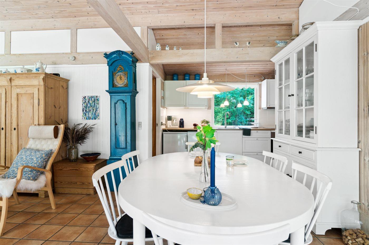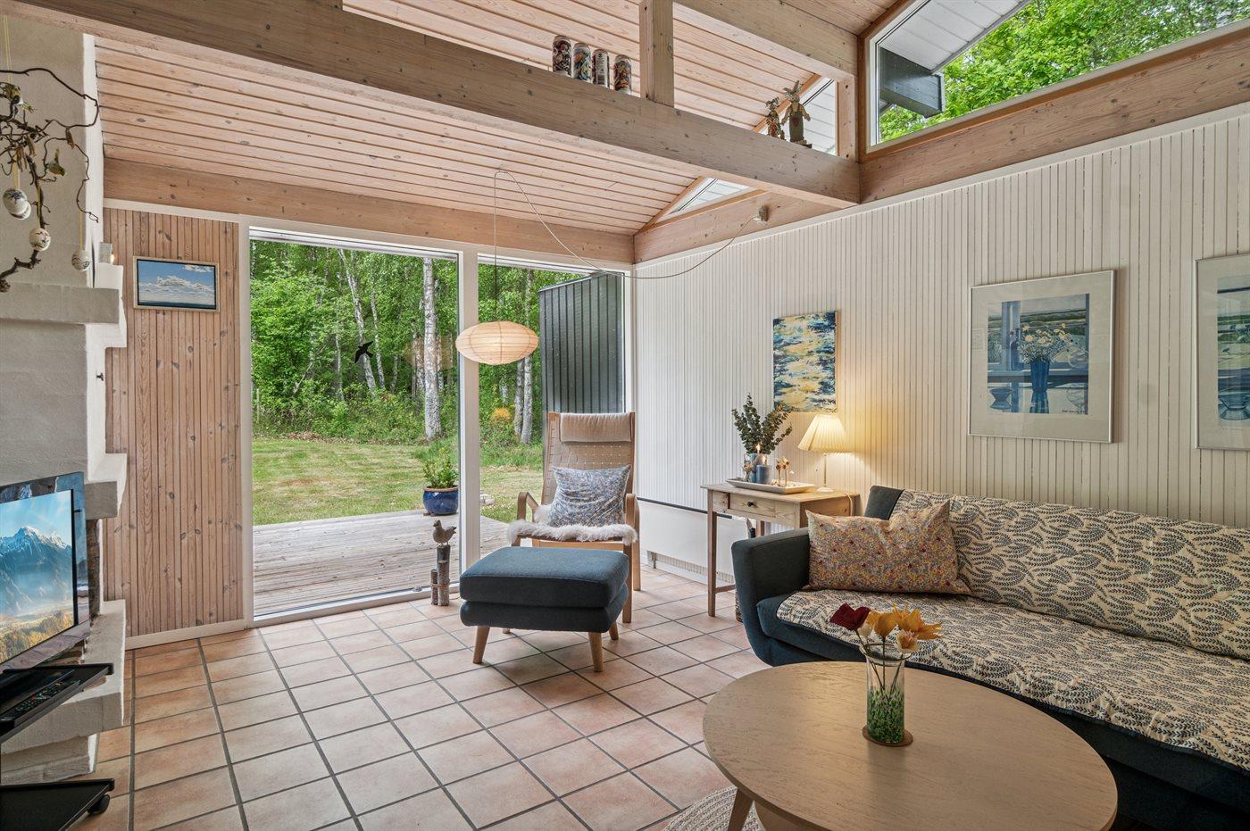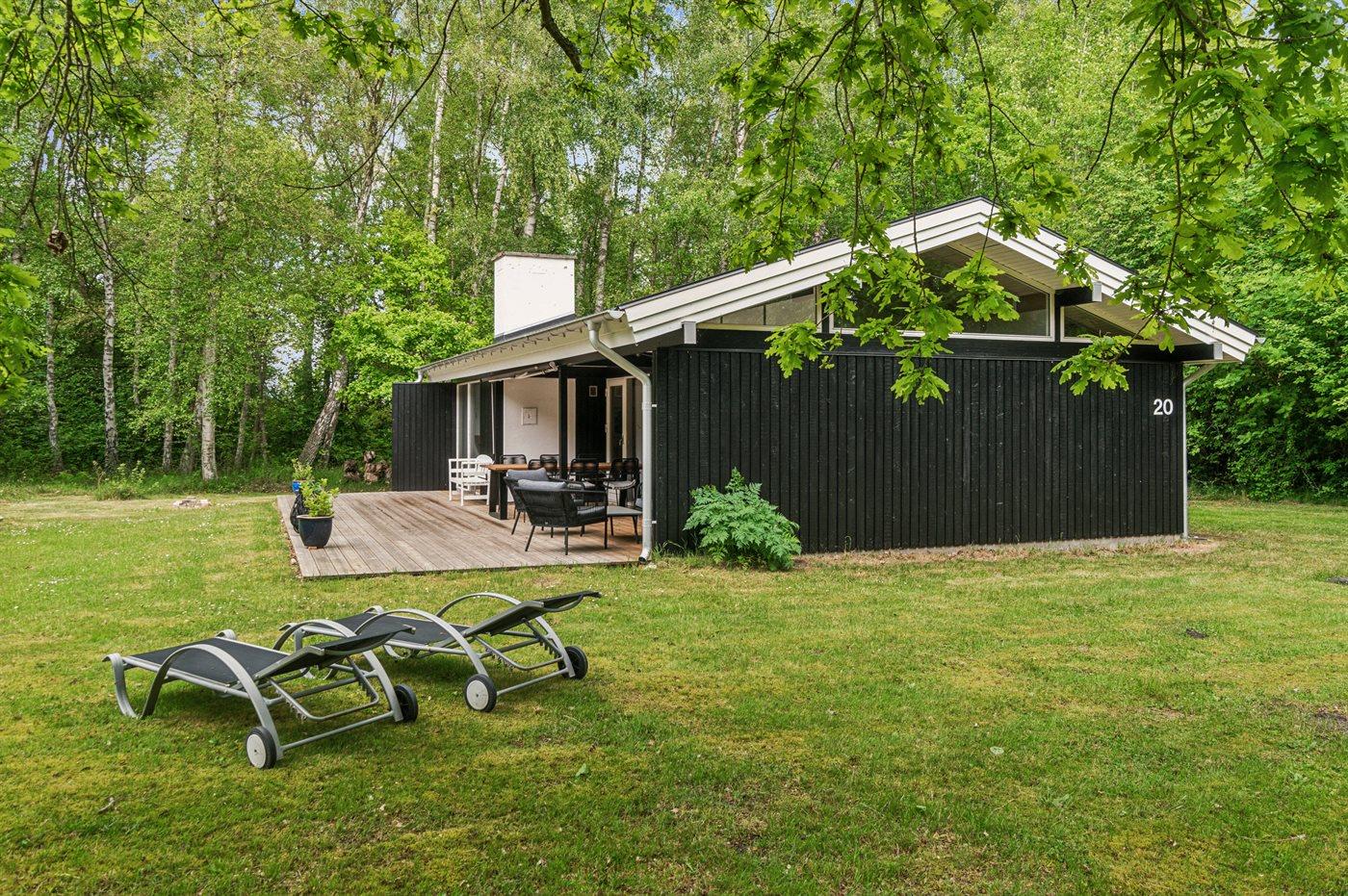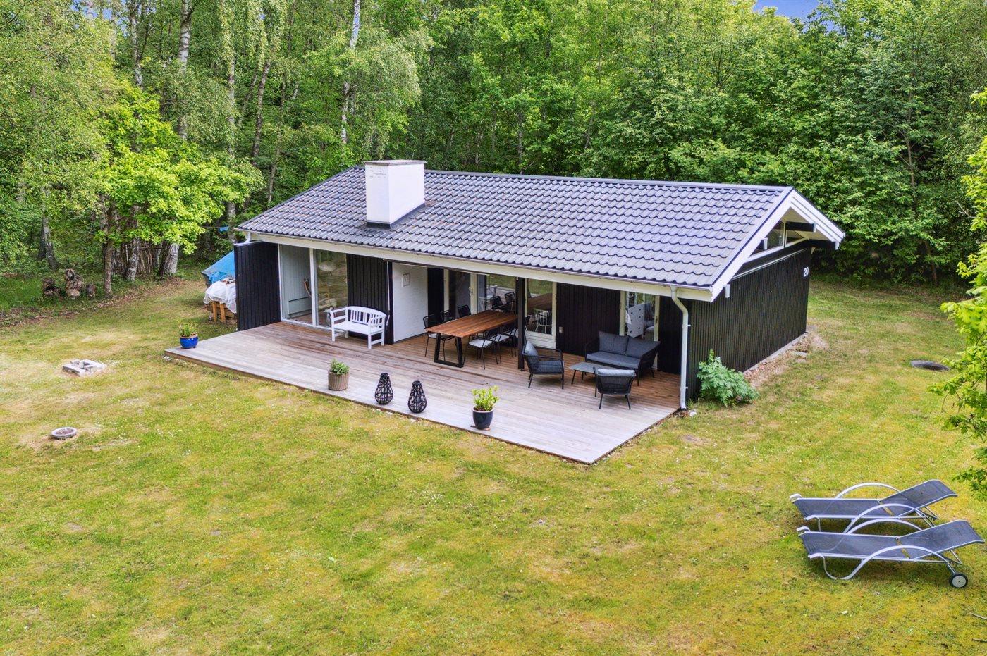 Das Haus ist gemütlich eingerichtet mit einer Küche, einem Essbereich und einem Wohnzimmer, von dem aus man Zugang zur westlich ausgerichteten Terrasse hat, ein Teil davon ist überdacht. In allen Räumen gibt es hohe Decken, und zusammen mit den hochgelegenen Fenstern in den Giebeln sorgt dies dafür, dass viel Licht und Luft im Haus vorhanden sind. Es gibt 3 Schlafzimmer, in 2 der Zimmer befinden sich Doppelbetten und im dritten Zimmer gibt es ein Einzelbett. Im Badezimmer gibt es eine Duschnische. Auf dem großen Grundstück gibt es gute Möglichkeiten zum Spielen, und Kinder können sich sicher bewegen.
