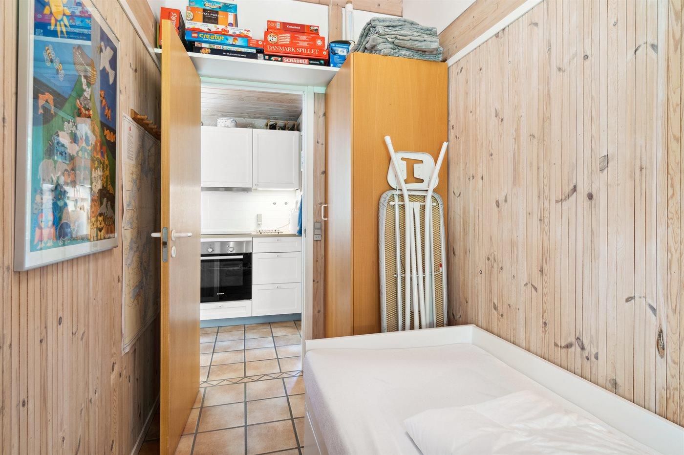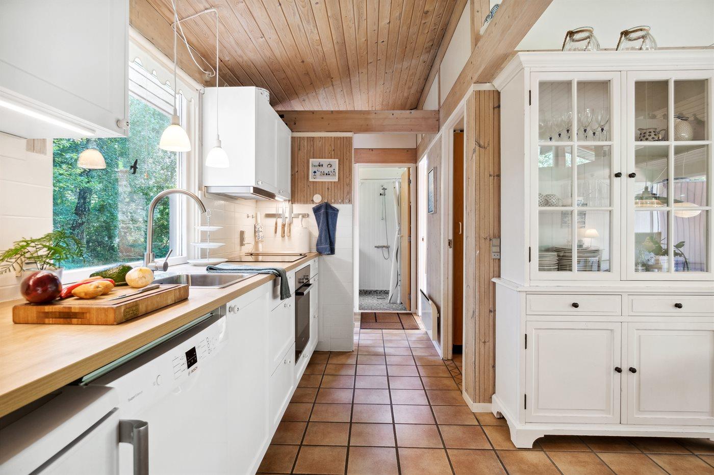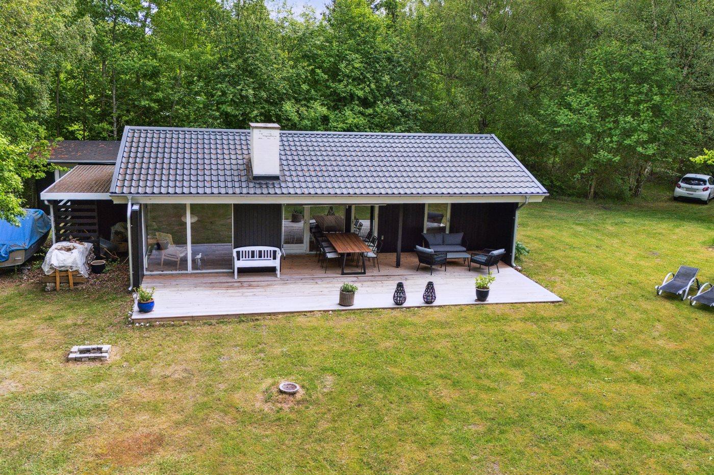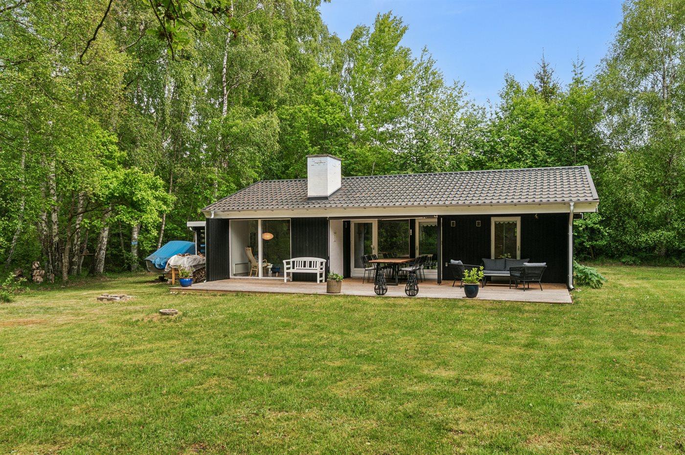 Das Haus ist gemütlich eingerichtet mit einer Küche, einem Essbereich und einem Wohnzimmer, von dem aus man Zugang zur westlich ausgerichteten Terrasse hat, ein Teil davon ist überdacht. In allen Räumen gibt es hohe Decken, und zusammen mit den hochgelegenen Fenstern in den Giebeln sorgt dies dafür, dass viel Licht und Luft im Haus vorhanden sind. Es gibt 3 Schlafzimmer, in 2 der Zimmer befinden sich Doppelbetten und im dritten Zimmer gibt es ein Einzelbett. Im Badezimmer gibt es eine Duschnische. Auf dem großen Grundstück gibt es gute Möglichkeiten zum Spielen, und Kinder können sich sicher bewegen.