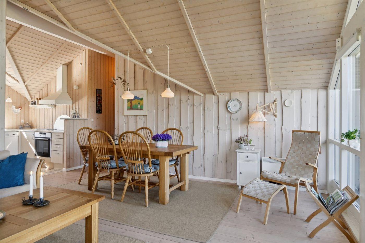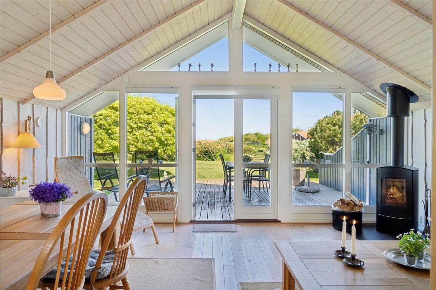 Das Haus ist hell und geräumig mit Decken bis zum First in allen Räumen und gutem Lichteinfall durch die großen Fenster im Wohnzimmer. Das Wohnzimmer und die Küche sind kombiniert und von hier aus gibt es direkten Zugang zur nach Norden ausgerichteten Terrasse, die teilweise überdacht ist. Hier kannst du die Aussicht und die Sonne genießen und der überdachte Teil bietet Schatten und Schutz vor dem Wind. Darüber hinaus gibt es eine nach Süden ausgerichtete Terrasse.