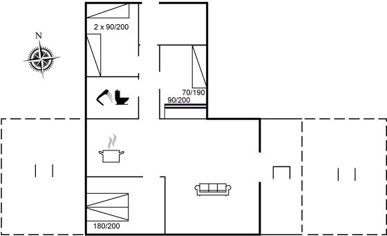Das Haus verfügt über 3 Schlafzimmer. Im größten Schlafzimmer gibt es ein Doppelbett, im zweiten zwei Einzelbetten. Im dritten Schlafzimmer befindet sich ein Etagenbett (70x190 cm) und ein Einzelbett. Badezimmer mit Duschnische und Fußbodenheizung. Im praktischen Hauswirtschaftsraum stehen eine Waschmaschine und ein Gefrierschrank zur Verfügung.