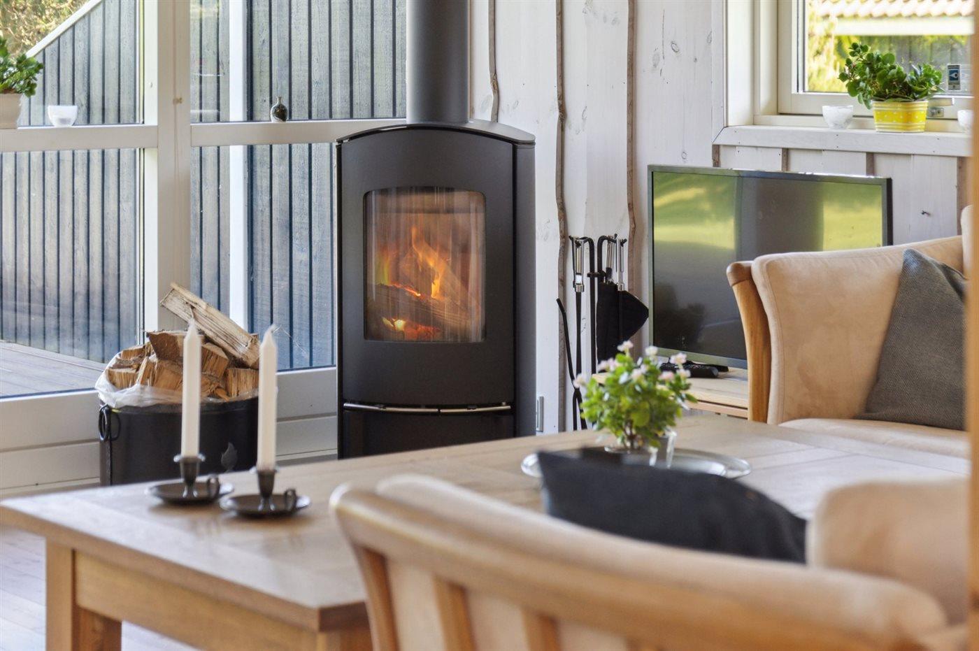 Das Haus wird umweltfreundlich mit einer Luft-zu-Luft-Wärmepumpe beheizt, und an kühleren Tagen sorgt der Kaminofen für Wärme und Gemütlichkeit.