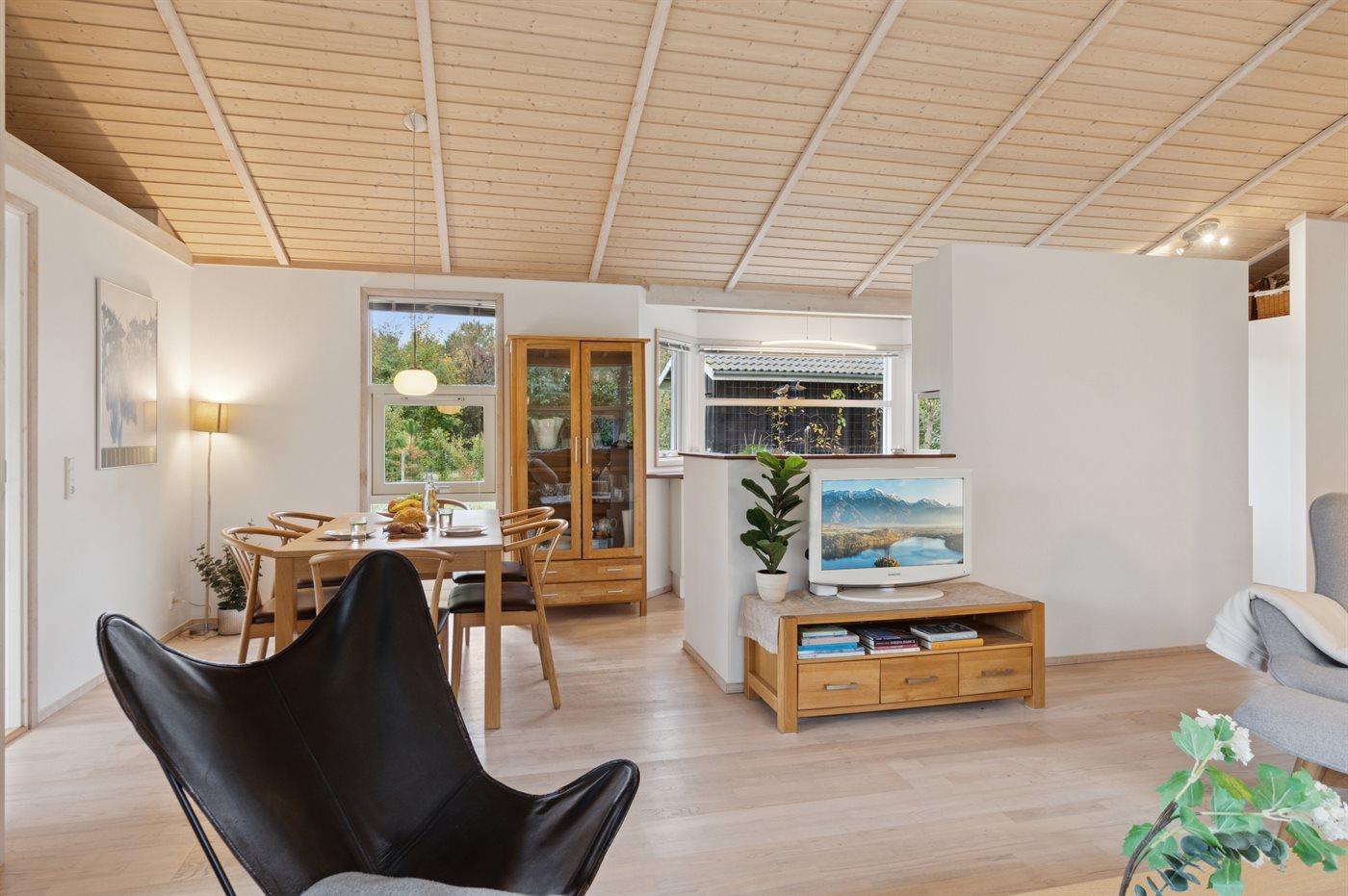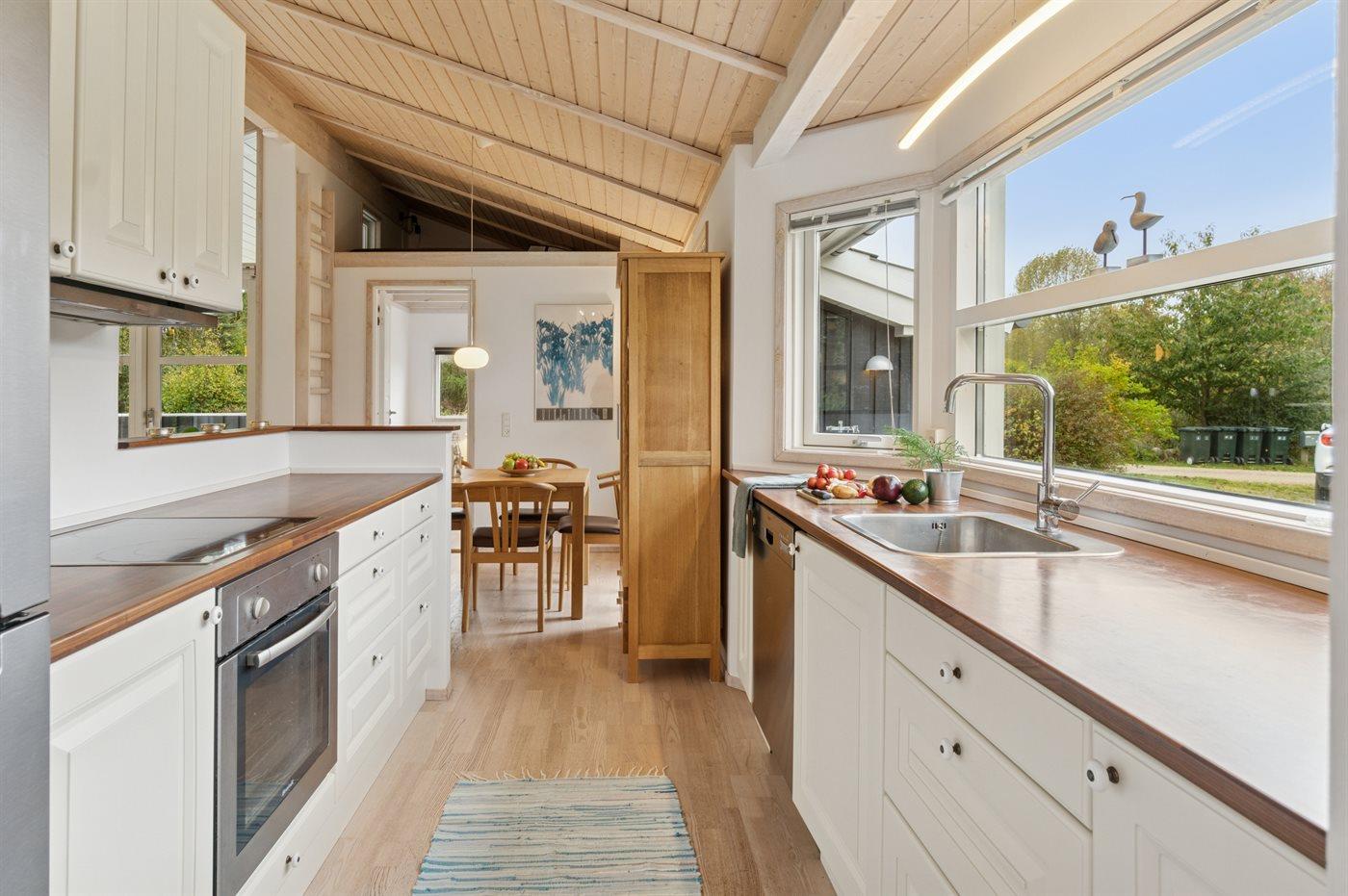 Küche, Essbereich und Wohnzimmer sind offen miteinander verbunden und bilden zusammen mit der großen, nach Süden ausgerichteten Terrasse die natürlichen Treffpunkte für das gemütliche Beisammensein mit Familie und Freunden. Ein Teil der Terrasse ist überdacht, sodass du dich im Schatten aufhalten und die langen, hellen Sommerabende genießen kannst. Im gesamten Haus sorgen Decken bis zum First und guter Lichteinfall für eine einladende Atmosphäre.
