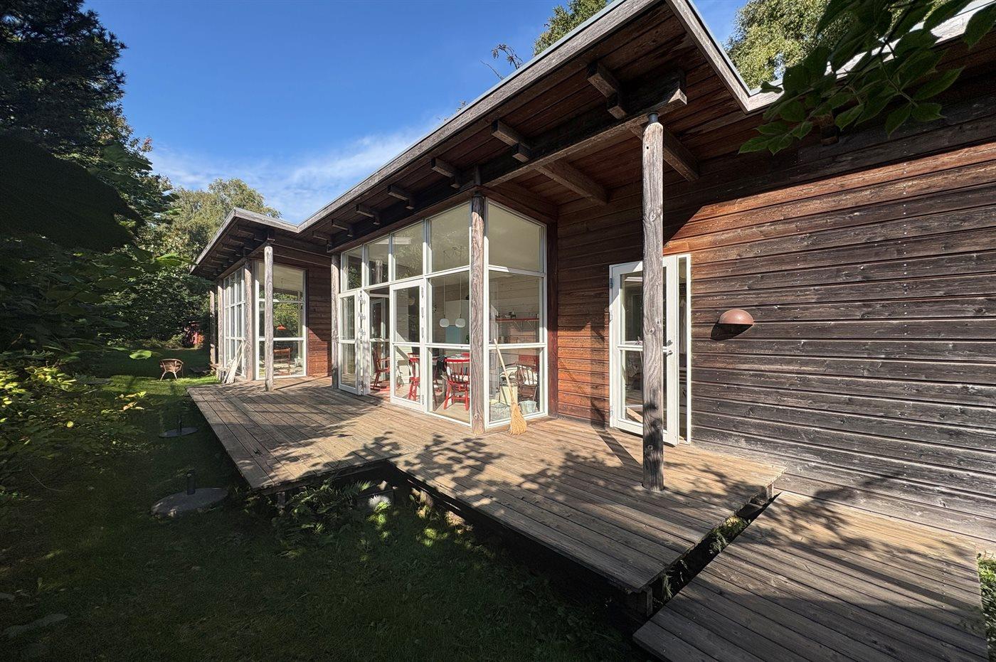 Das Haus besticht durch moderne Architektur, hohe Decken in mehreren Räumen und viel Tageslicht durch große Fensterfronten sowie Dachfenster, sodass es überall hell und angenehm zum Verweilen ist. Vom Küchenbereich gelangst du direkt auf die Terrasse, ebenso vom Wohn- und Essbereich, der ebenfalls Zugang zum Garten und zur Terrasse bietet. Ein großer Teil der Terrasse ist überdacht, sodass du Schatten und Schutz findest und die langen, hellen Sommerabende genießen kannst.