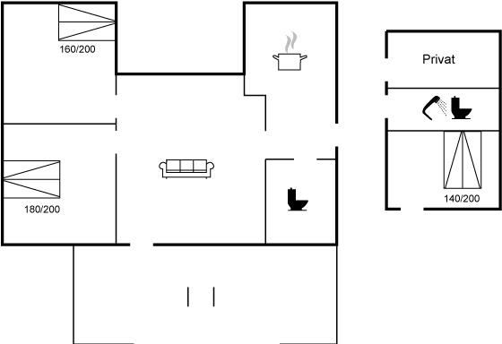 In der Küche, die an den Essbereich angrenzt, gibt es eine kleine Sitzecke, wo du u. a. eine Tasse Kaffee genießen kannst. Das Haus ist mit 2 Schlafzimmern ausgestattet, beide mit Doppelbetten. Im Gästehaus gibt es ein weiteres Doppelbett. Im Haus gibt es ein Gästetoilette, während sich das Badezimmer mit Toilette und Duschnische im Gästehaus befindet.