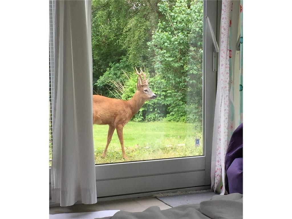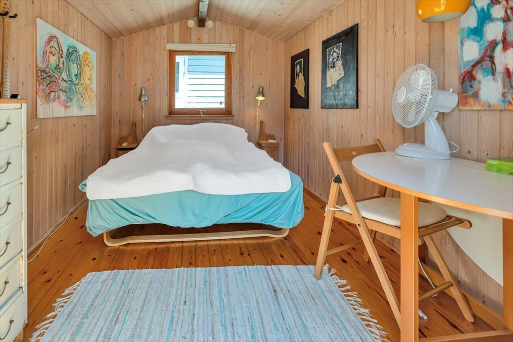 Das eine Schlafzimmer mit dem Holzofen hat 2 Einzelbetten und funktioniert wie ein kombiniertes Schlafzimmer und Arbeitsraum, wo man arbeiten kann und den Blick von dem kleinen Wald und dem Garten genießen. Die Panoramafenster mit den zwei Schiebetüren lassen viel Licht herein und ermöglichen die Hirsche, die auf dem Naturgrundstück herumstolzieren, zu beobachten. Wenn Sie Glück haben, kommen die ganz nah an dem Haus. Der Schlafraum hat auch eine kleine Pergola-Terrasse, wo man sitzen kann und sich über den Blick von dem Garten erfreuen. Wir empfehlen, dass man den Holzofen in den Sommermonaten nicht benutzt.