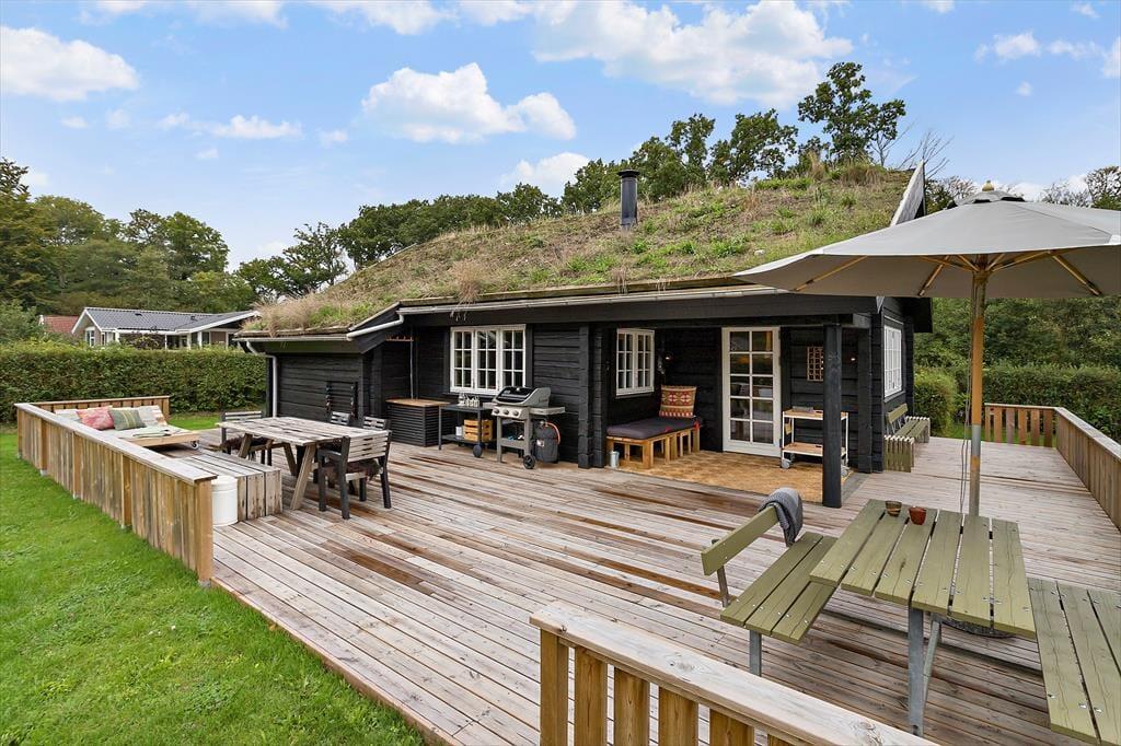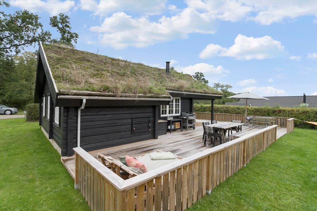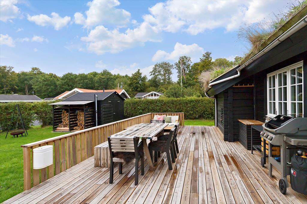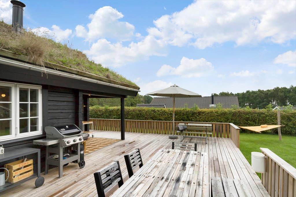 Vom kombinierten Küchen-, Wohn- und Essbereich gelangen Sie hinaus auf eine große Holzterrasse, die das halbe Ferienhaus umgibt. Auf dieser Terrasse verleben Sie entspannte Stunden in der Sonne und gesellige Grillabende. Der überdachte Terrassenbereich bietet sich gut als Aufenthaltsplatz für die langen, hellen Abendstunden an. Der große Garten animiert zum Spielen und Umhertollen. Nach einem Bad in der Ostsee spült Ihnen die Außendusche den Sand und das Salz des Meeres von der Haut.