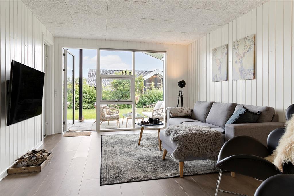 Auf dem Sofa vor den großen, nach Süden ausgerichteten Fenstern herrscht eine richtig gemütliche Ferienhausstimmung. Es ist der perfekte Ort, um mit einem Buch zu entspannen oder einen guten Film zu schauen. Hier könnt ihr euch wirklich erholen und den Urlaub genießen.