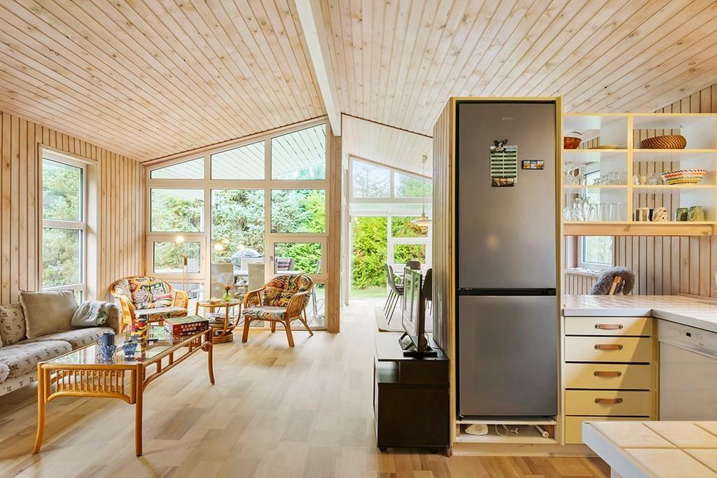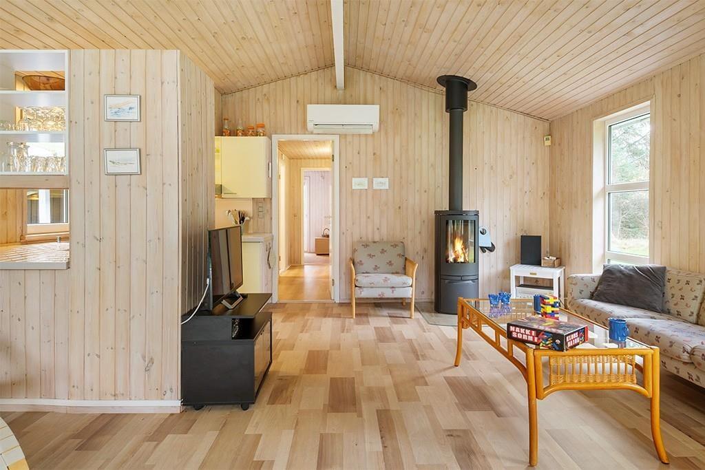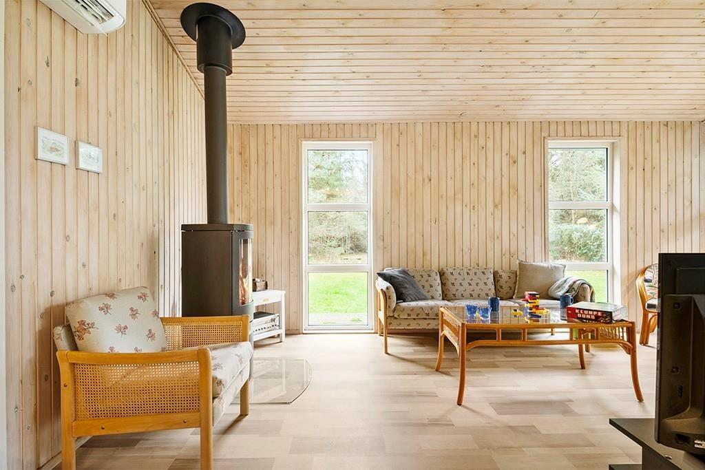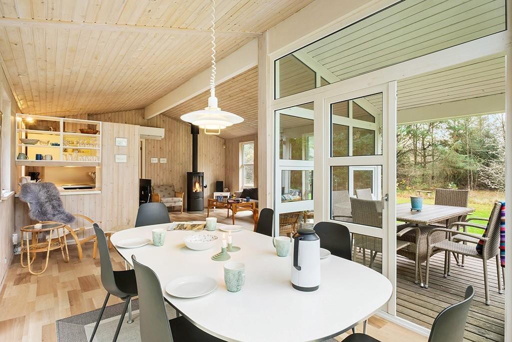 Im Inneren dieses charmanten Ferienhauses empfängt dich eine helle und großzügige Atmosphäre. Das Wohnzimmer ist der ideale Treffpunkt mit seinem Kaminofen, der an kühlen Abenden für gemütliche Wärme sorgt. Die großen Fenster im Wintergarten lassen das Licht und die Natur herein, sodass du die fantastische Aussicht genießen kannst, selbst wenn das Wetter nicht zu einem Aufenthalt im Freien einlädt. Die offene Wohnküche ist perfekt für gemeinsames Kochen und gemütliche Mahlzeiten, und hier könnt ihr sowohl die Morgensonne als auch das Beisammensein genießen. Mit Platz für die ganze Familie ist dieses Ferienhaus ideal für geselliges Zusammensein und Entspannung.