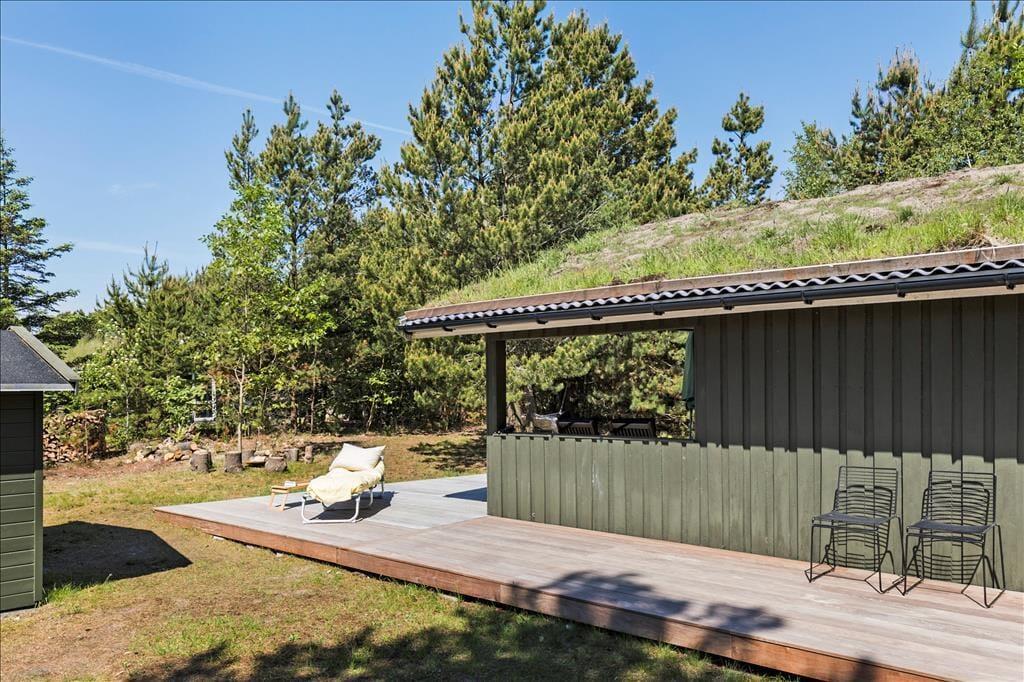 Eine große Glastür im Wohnzimmer gibt Ihnen direkten Ausgang zu einer grossen teilweise überdachten Holzterrasse, welche sich auf drei Seiten des Hauses ausbreitet. Deshalb ist es leicht den ganzen Tag über einen sonnenreichen Platz zu finden – und sogar mit Aussicht auf die hübschen Kiefern, welche auf dem Naturgrundstück stehen. Ist es sommerlich warm, gönnen Sie sich im Schatten eine Pause in der Hängematte, außerdem gibt es die Möglichkeit sich unter der Außen Dusche zu erfrischen.