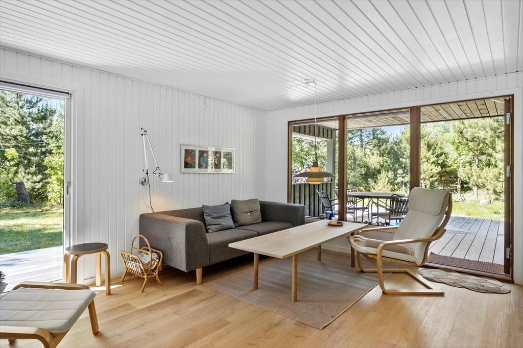 Im Inneren des Hauses ist es angenehm sich aufzuhalten Dank der hellen Einrichtung und den bewährten Bauplan. Im Wohnzimmer trägt ein Kaminofen zu der gemütlichen Atmosphäre bei, und so ist es auch hilfreich für die Ferienstimmung, dass Sie auf das schöne Naturgrundstück hinausschauen können, ungeachtet dessen ob Sie sich es im Sofa gemütlich machen, am Esstisch sitzen oder in der offenen Küche das Essen zubereiten. Im Übrigen steht im Wohnzimmer eine Couch, perfekt für einen Mittagsschlaf oder das Lesen der Zeitung. Der Nachtschlaf kann in einem der zwei Schlafzimmer stattfinden, welche insgesamt Platz für vier Personen bieten. Ein Badezimmer mit Dusche und ein Haushaltsraum mit Waschmaschine sind ebenfalls ein Plus des Hauses.