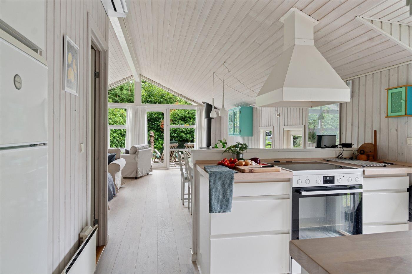 Wohnzimmer und Küche sind offen miteinander verbunden, und von hier aus hast du direkten Zugang zur schönen Holzterrasse.