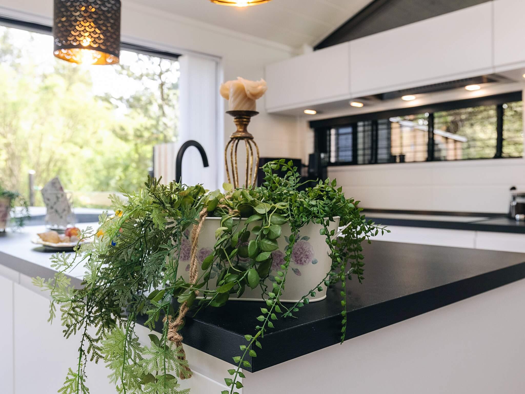 Die großen Fenster sorgen für viel Licht und bieten einen Blick auf die vielen Bäume auf dem Naturgrundstück.