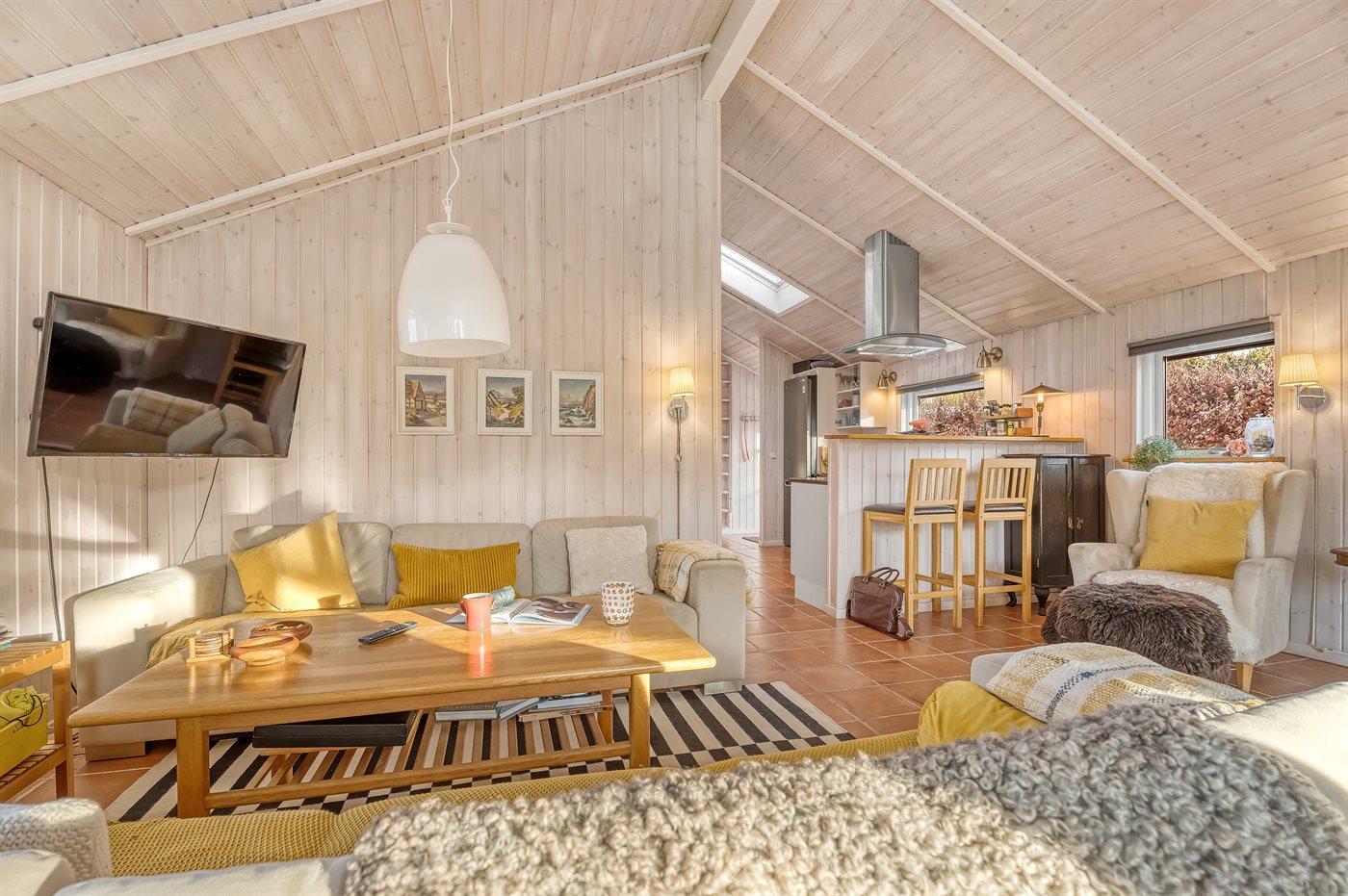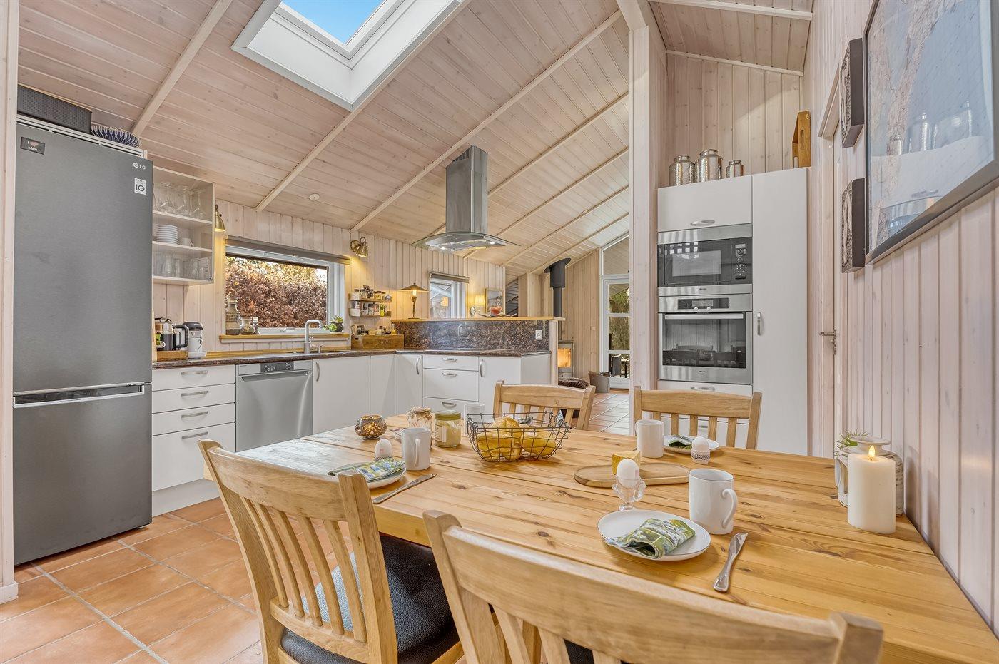 Ein helles und einladendes Ferienhaus mit u. a. Kaminofen.